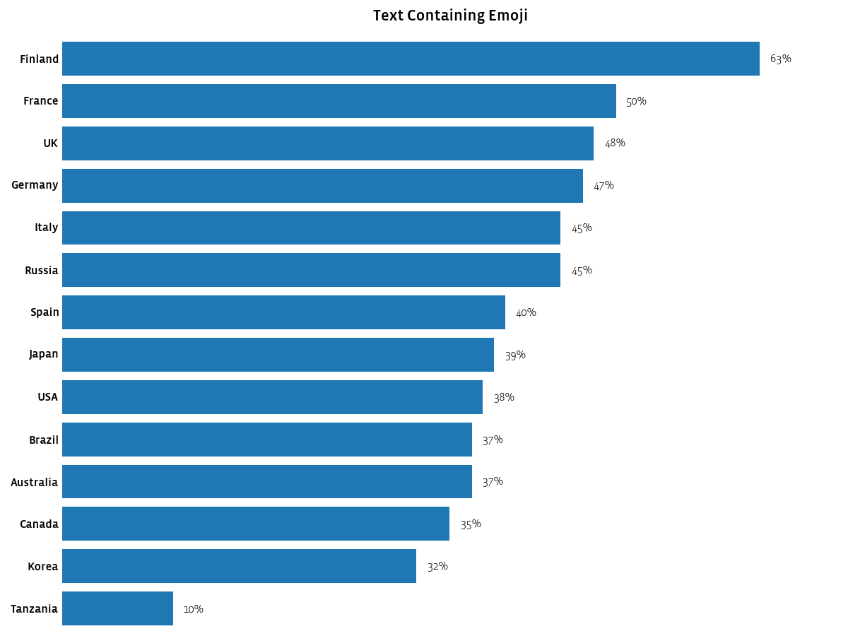 На следующем графике мы видим, что жители Финляндии наиболее зависимы от жёлтых мордочек, заменяющих слова. В России большая часть людей всё ещё пользуется обычными словами.