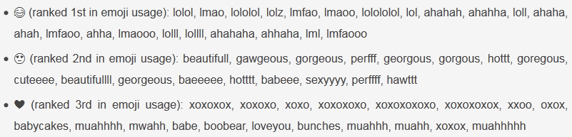 Тройка самых часто используемых смайликов и слов идущих с ними в паре выглядит таким образом: