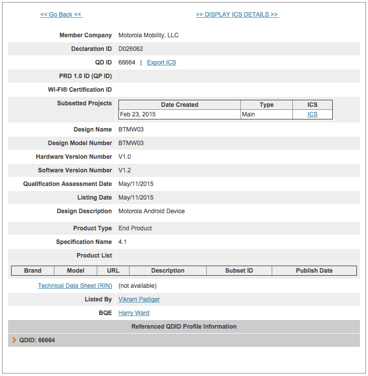 Не так давно в сети была замечена специфическая «утечка» информации: генеральный директор компании Lenovo показал фотографию умных часов Motorola Moto 360 второго поколения после того, как интернет-пространство стало полниться слухами о том, что к выходу в свет готовится вторая версия данного устройства. Однако сегодня у нас, кажется, появилась пусть и небольшая, но самая свежая порция информации об умных часах. Данные, с которыми мы сегодня ознакомимся, стали известны благодаря тому, что на сайте Bluetooth SIG засветились эти самые часики, но под кодовым названием BTMW03. Оригинальная модель устройства имела номер модели BTMW01.
