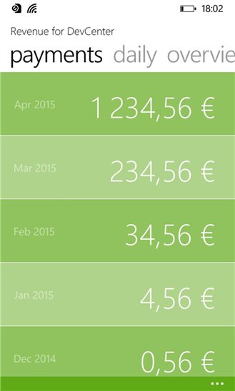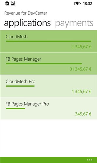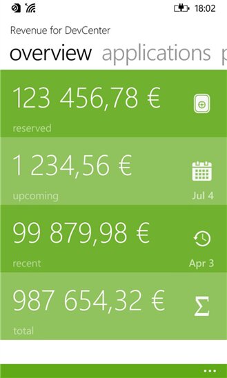 «Revenue for DevCenter» содержит информацию по состоянию счетов, выборку по всем приложениям разработчика, ежедневную и ежемесячную статистику, и другую информацию. Приложение обладает «живой» плиткой, которая отображает текущее состояние счета. «Revenue for DevCenter» распространяется бесплатно, но с встроенной рекламной, которую можно отключить единоразовым платежом.