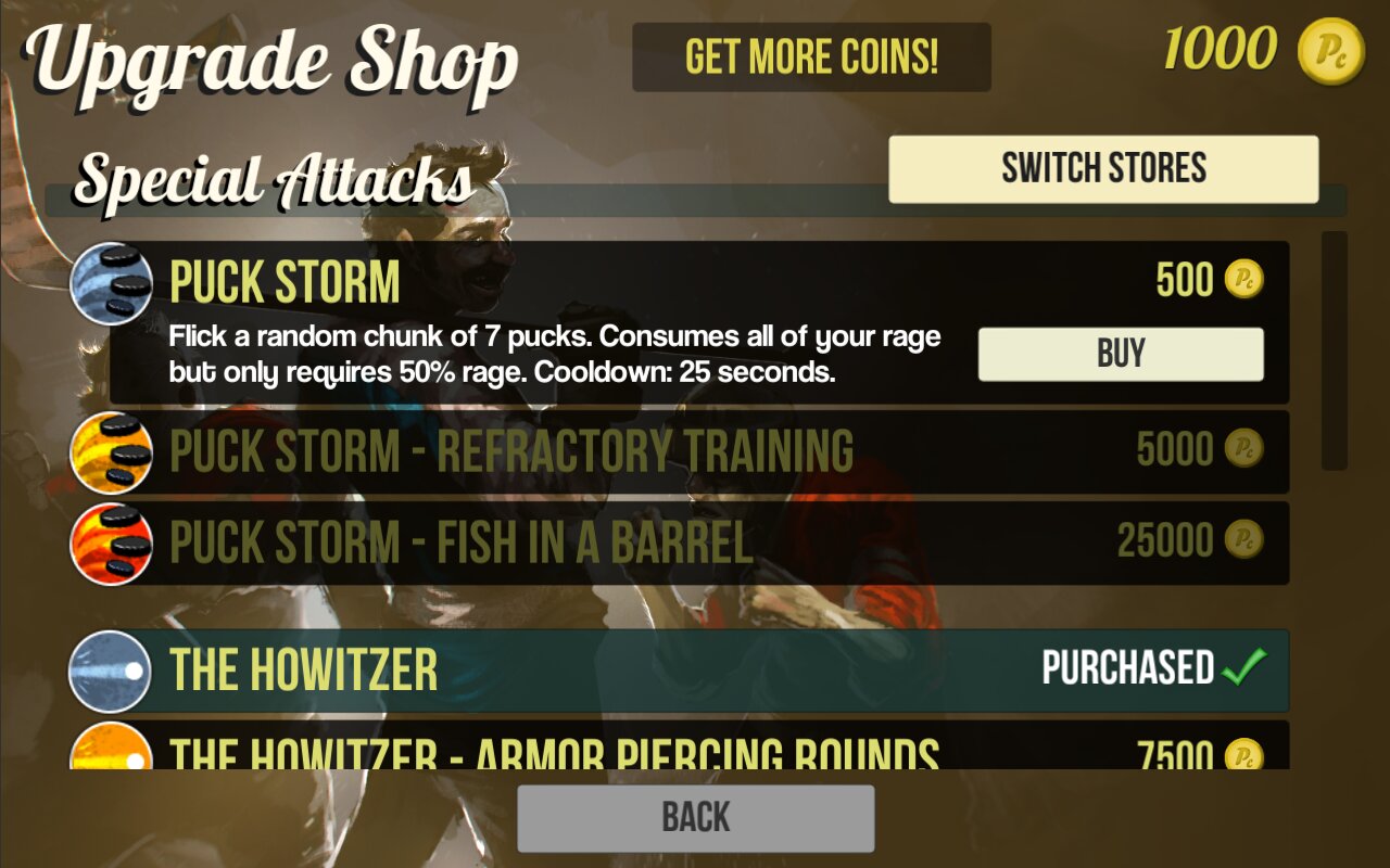 За каждого сбитого противника вы получаете монетки. По мимо этого, их можно заработать выполняя задания (например, сбить 10 противников, разбить 20 бутылок или сыграть тройку раз). На монеты можно приобрести большое количество улучшений, начиная с костюмов и головных уборов и заканчивая активными навыками, которые помогут в очередном забеге. Super Puck Jam — пример того, как можно «играться» с жанрами и создать нечто действительно интересное.