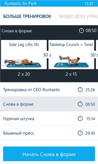 Установи приложение для тренировки пресса Runtastic Six Pack и начни работать над собой прямо сейчас вместе с Runtastic! Смотри HD видео, повторяй упражнения за виртуальными инструкторами Runtastic и выполняй интенсивные тренировки для мышц живота и всего торса с помощью твоего Windows Phone! Подбери индивидуальную тренировку, начни заниматься и создай тело своей мечты!