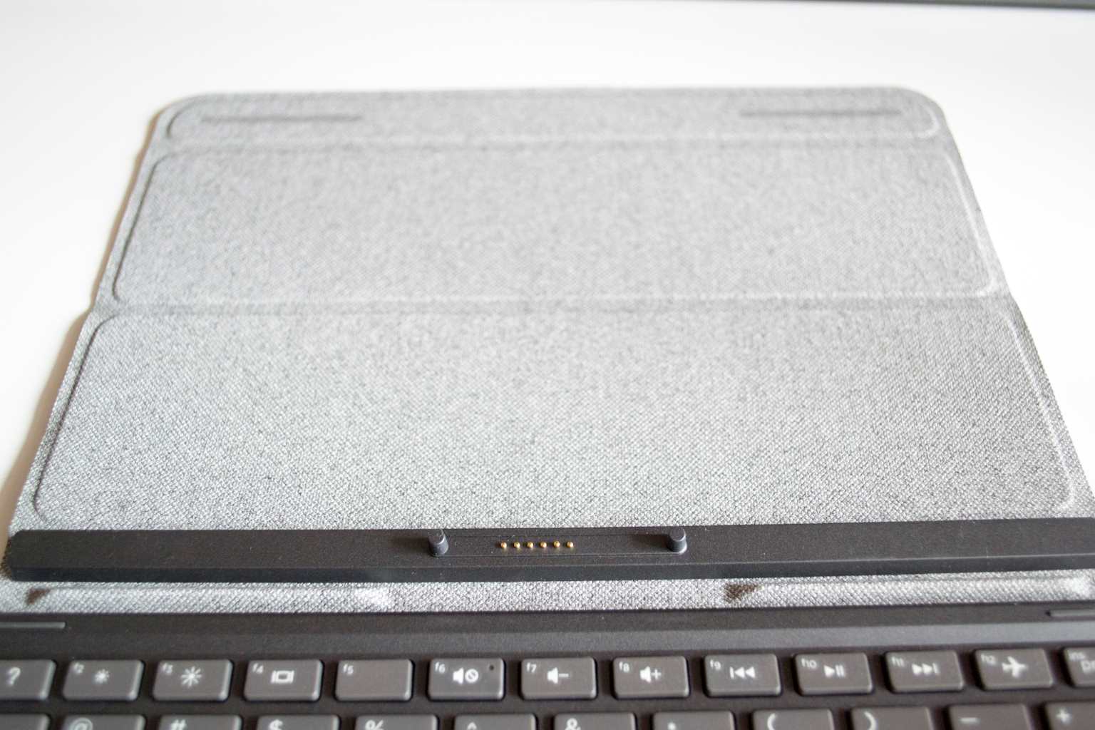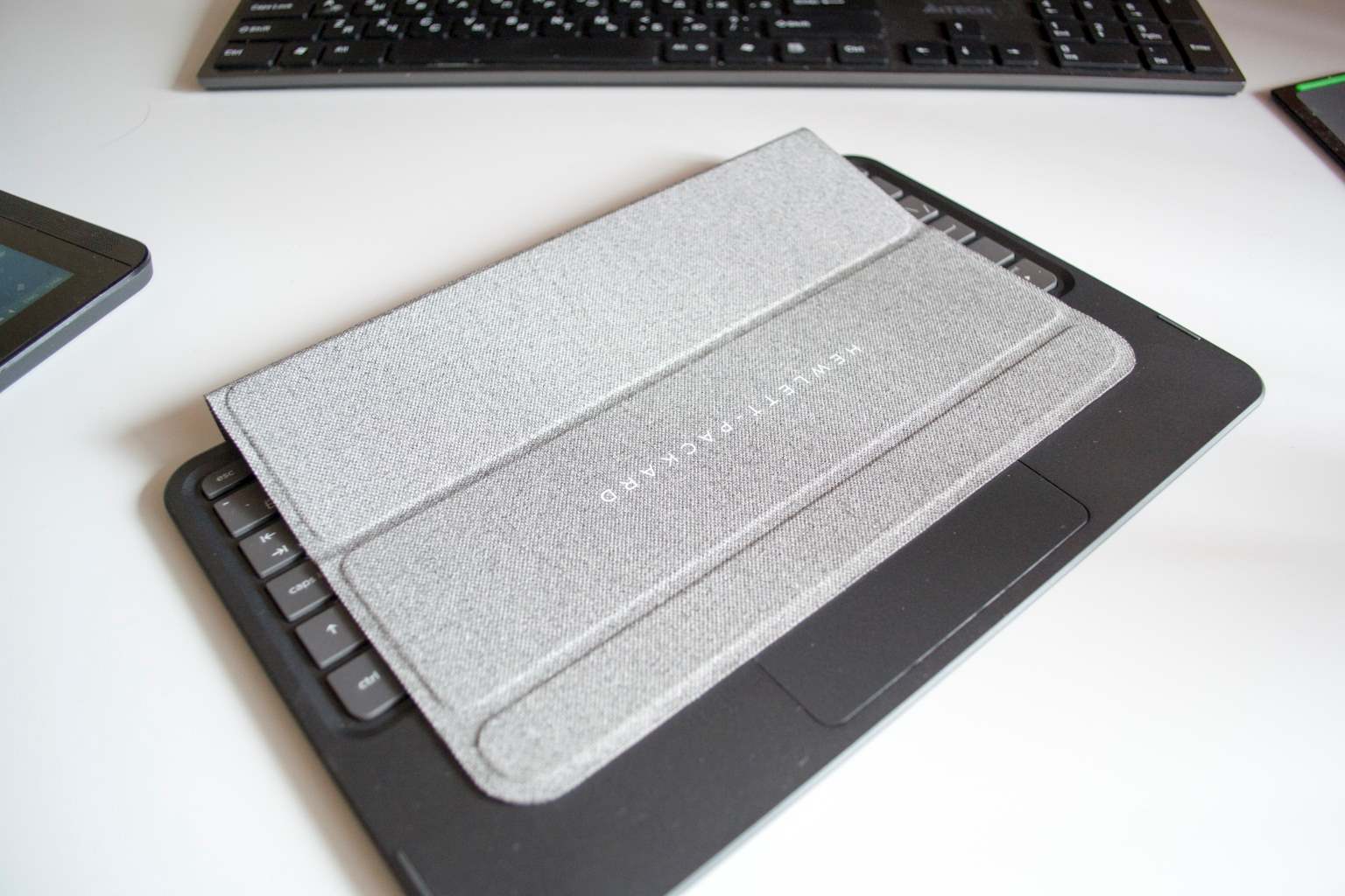 Сама клавиатура выполнена в тон планшета — светло-серого цвета. Обложка выполнена из светло-серой ткани, она разделена на три секции, которые при сгибе образуют подставку для планшета. В неё встроены магниты для присоединения к самому планшету в двух положениях.