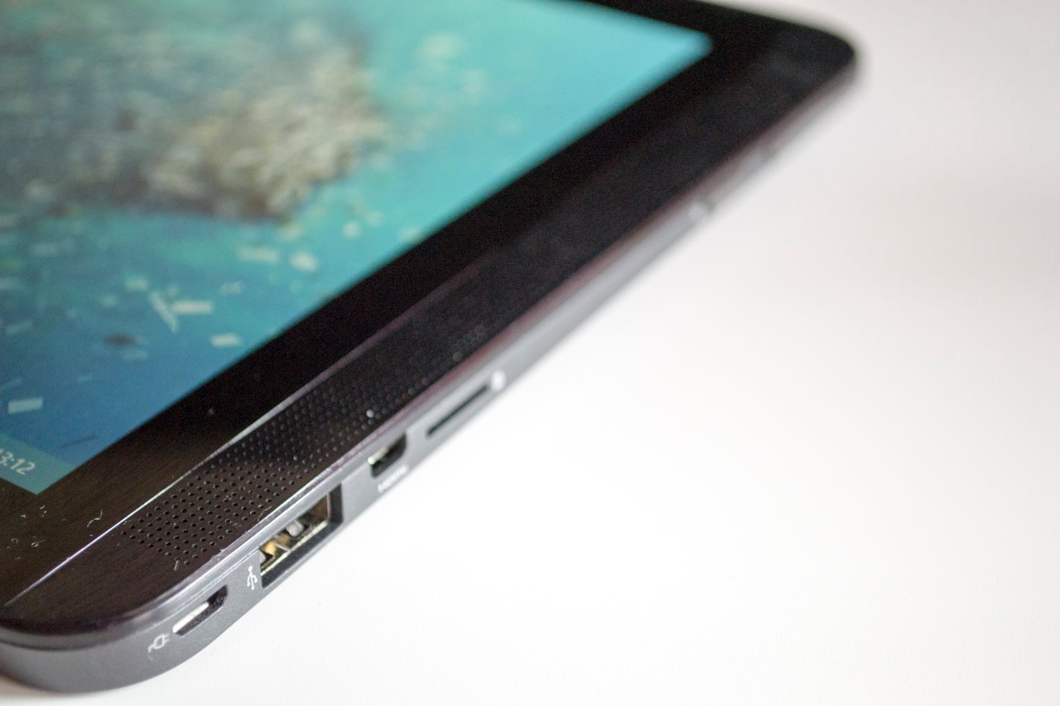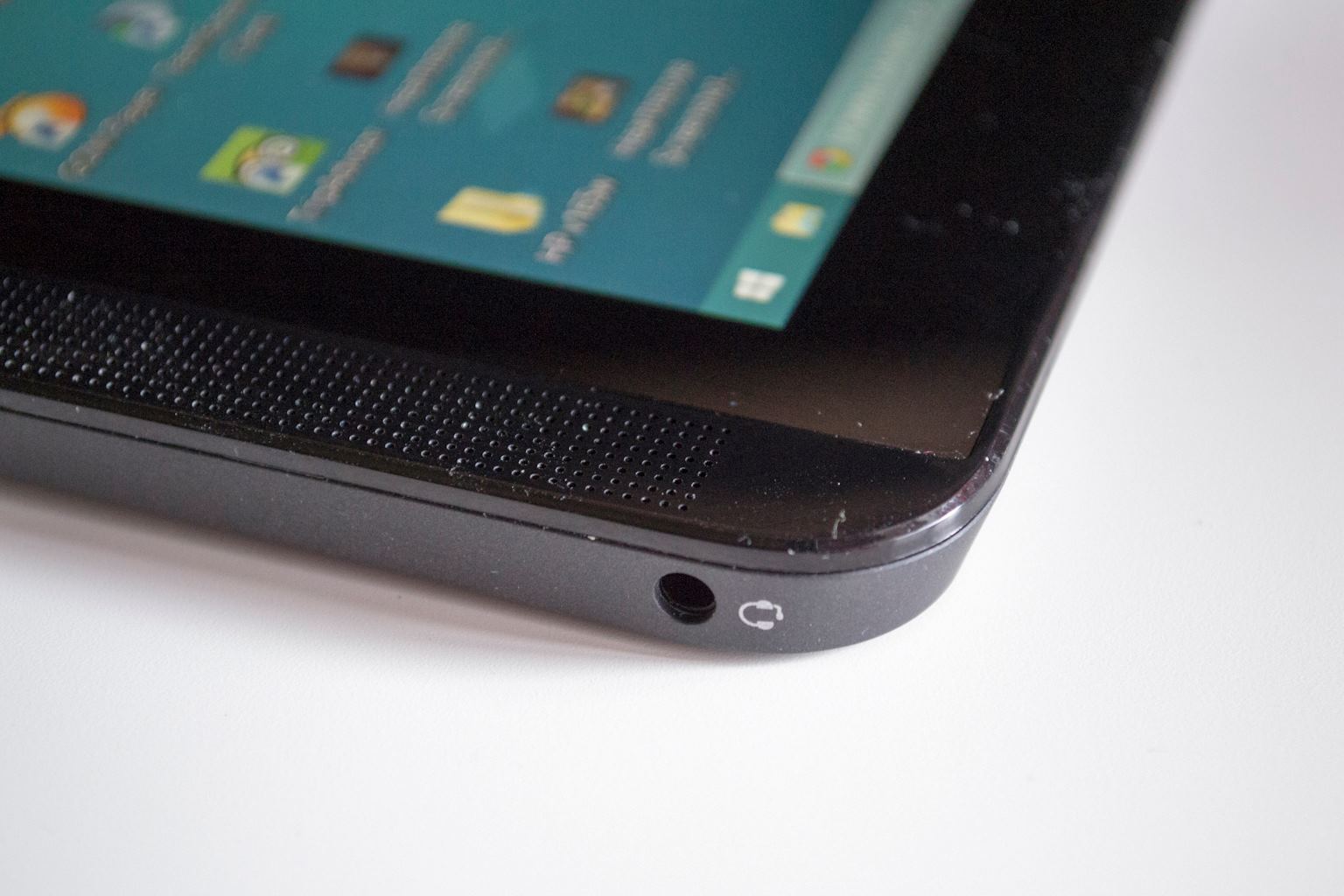 Слева на торце планшета находится 3,5 мм, стандартный, аудио-разъем. Все кнопки находятся справа: клавиша-качелька регулировки громкости, кнопка Windows (очень жесткая) и три разъёма: micro-USB, USB и micro-HDMI. С кнопками громкости проблем нет — они нажимаются свободно.