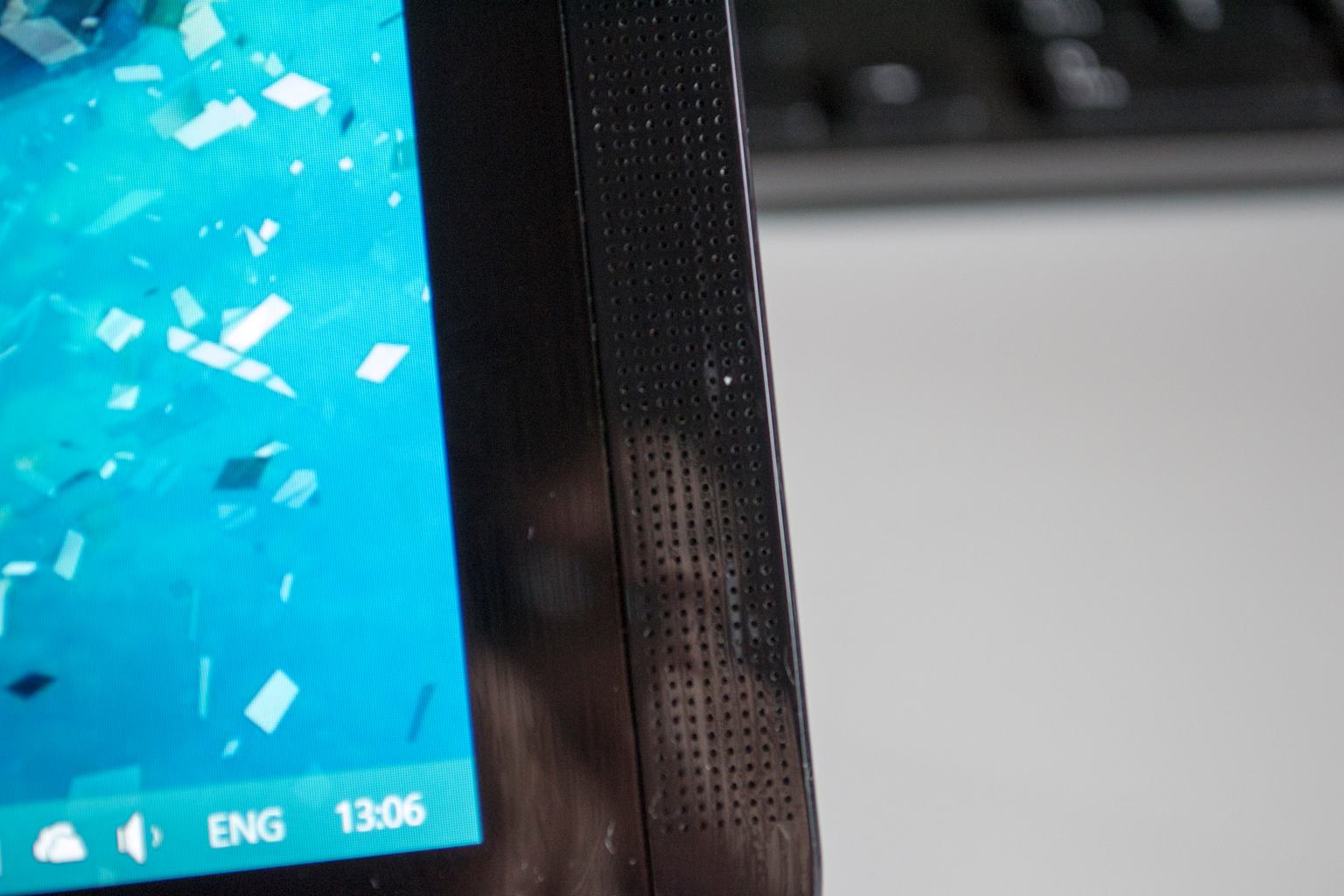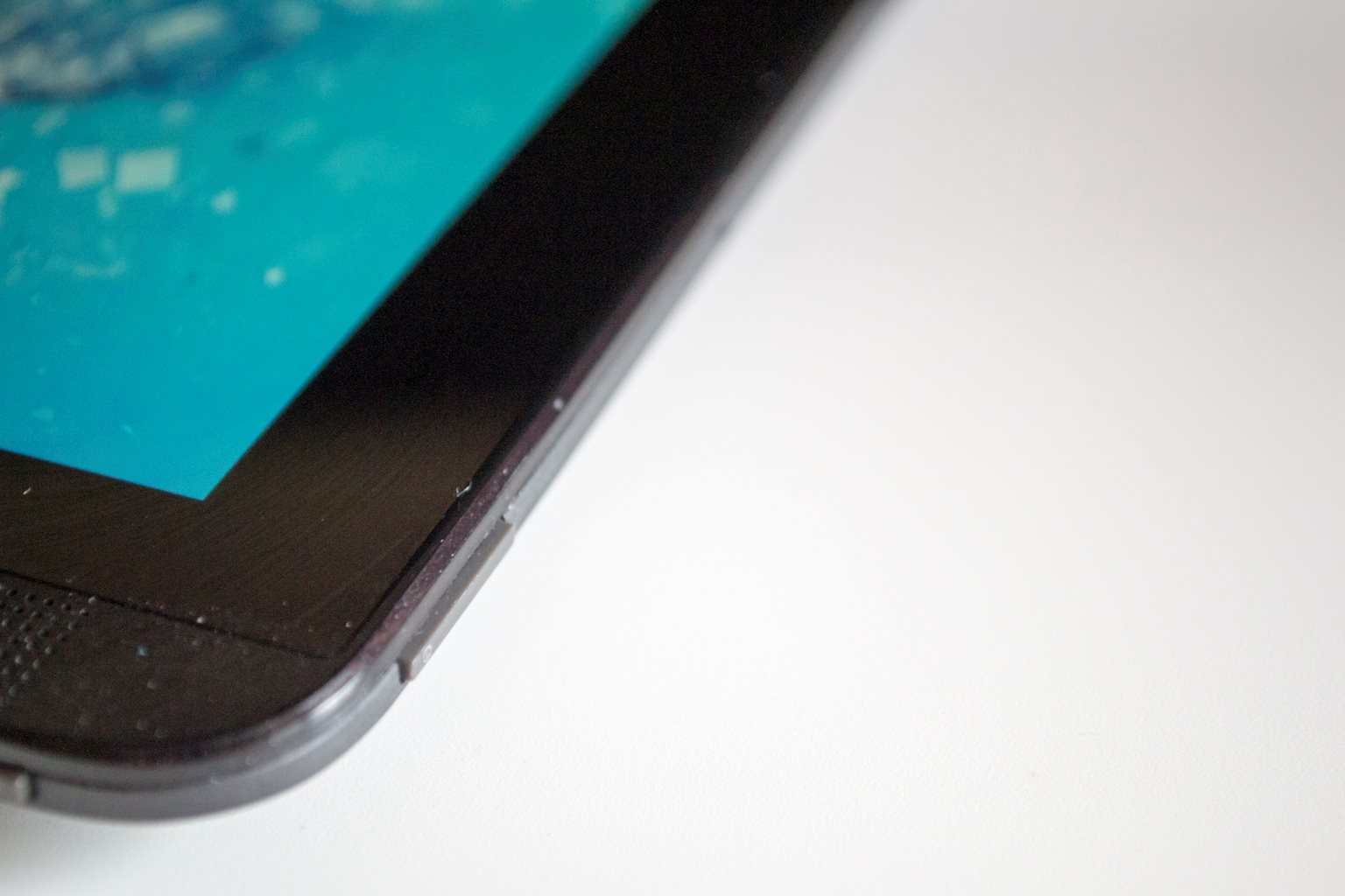По бокам находятся два динамика. Логотип компании можно заметить в верхнем левом углу. Благодаря широким рамкам, держать планшет удобно, к тому же они не портят внешний вид планшета.