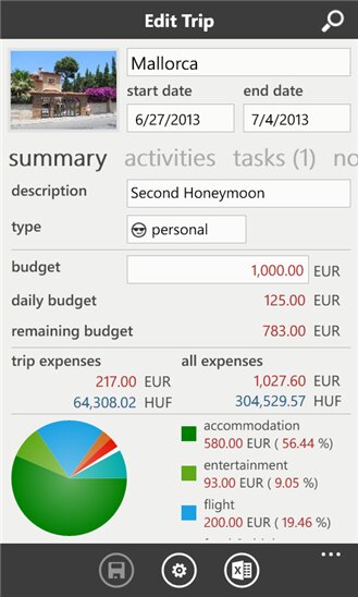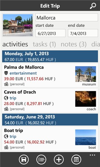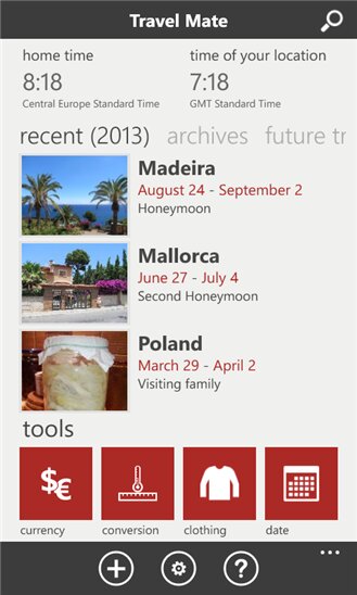 Используя Travel Mate вы можете наперед тщательно планировать поездки и путешествия. Запишите все задачи, создайте план деятельности и расходов. Для этого будут предоставлены актуальные или пользовательские курсы валют. В свой дневник можно вписать разные контактные данные, маршруты и добавлять фотографии. А красочные заметки помогут не забыть важную информацию. Данные можно экспортировать в документы Word и книги Excel.