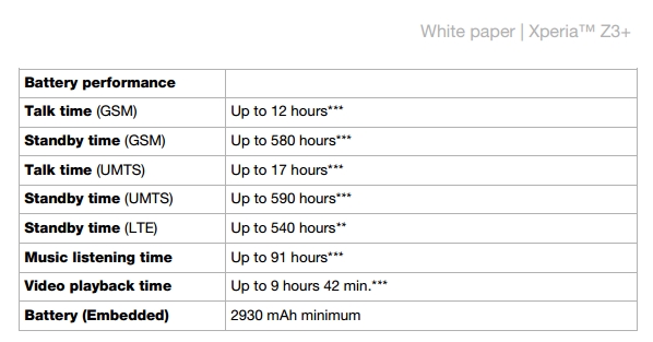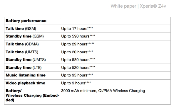 Если верить данным, представленным Sony выше, батарея устройства Xperia Z4v в некоторых случаях предоставляет пользователю устройства больше автономного времени работы смартфона, нежели батарея оригинального смартфона. Например, время работы в режиме разговора у Xperia Z3+ составляет 12 часов, а у Xperia Z4v — 17 часов. Время работы в режиме прослушивания музыки у Xperia Z4v составляет 95 часов, в то время как у Xperia Z3+ — 95 часов . В то время как продолжительность работы, например, в режиме ожидания (LTE) у Xperia Z3+ составляет 540 часов против 520 у Xperia Z4v.