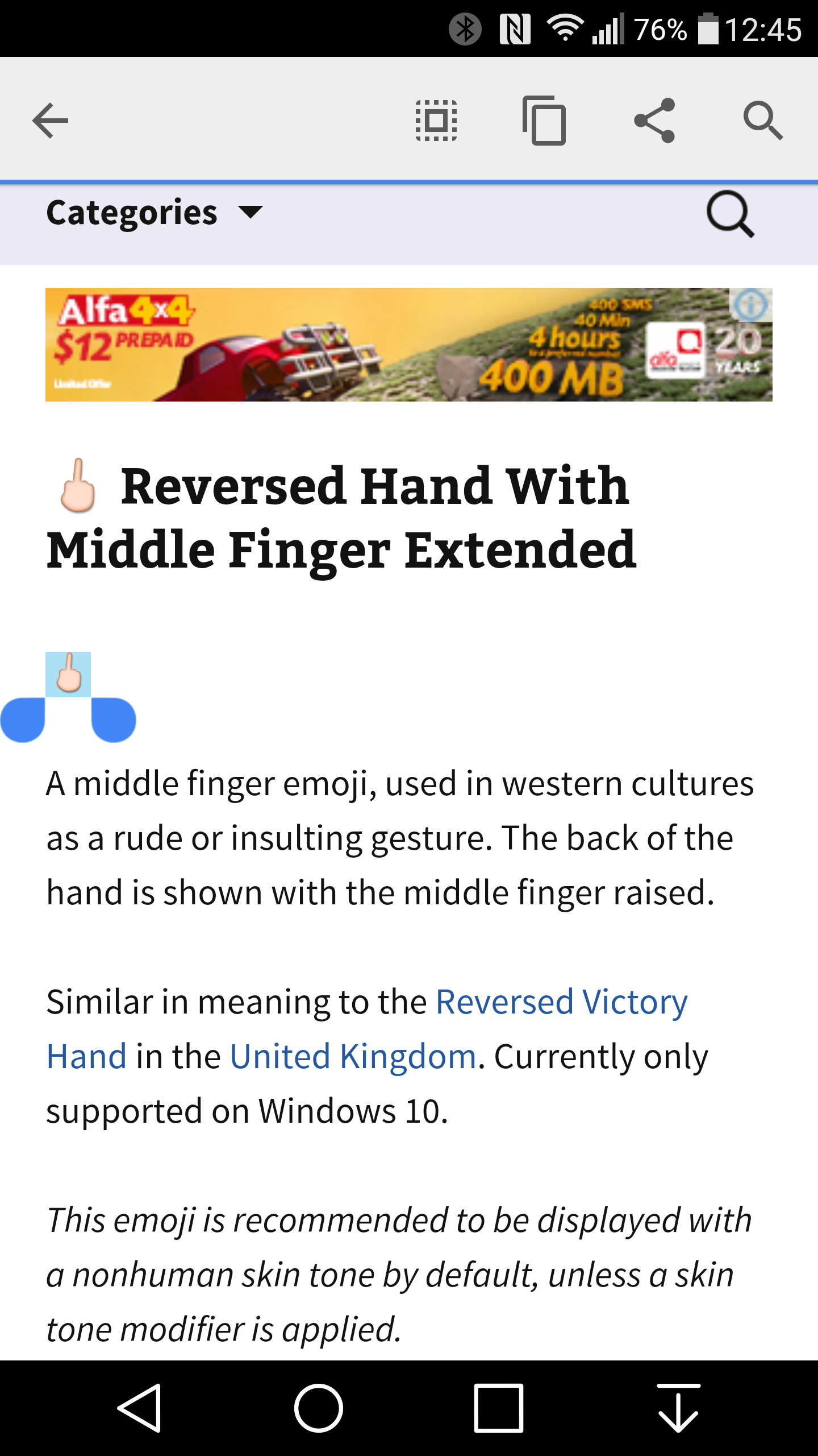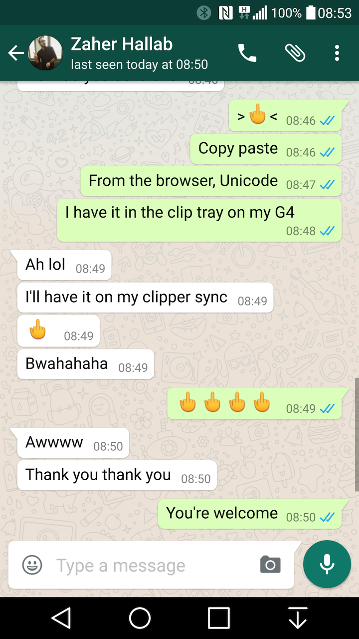 Нового смайла со среднем пальцем пока нет в стандартном списке Emoji внутри WhatsApp*, но его все равно можно использовать. Идеограмма имеет кодовый номер U+1F595, а ее название в рамках WhatsApp* — «Flippin», что является цензурированной версией английского ругательства, начинающегося на «fu» и заканчивающегося на «ing». Чтобы отправить смайл в WhatsApp*, вам нужно всего лишь скопировать его где-то извне, даже несмотря на то, что он не отображается, и вставить в чат. Скопировать идеограмму можно на порталах, посвященных Emoji-смайлам — Emojipedia и Graphemica. К сожалению, кодировка, которая используется на Трешбкосе, не позволяет даже вставить в редактор такой символ. Надеемся, что вы будете использовать новый смайл только в самых «экстренных» ситуациях, когда это уместно.