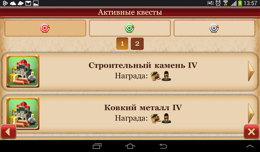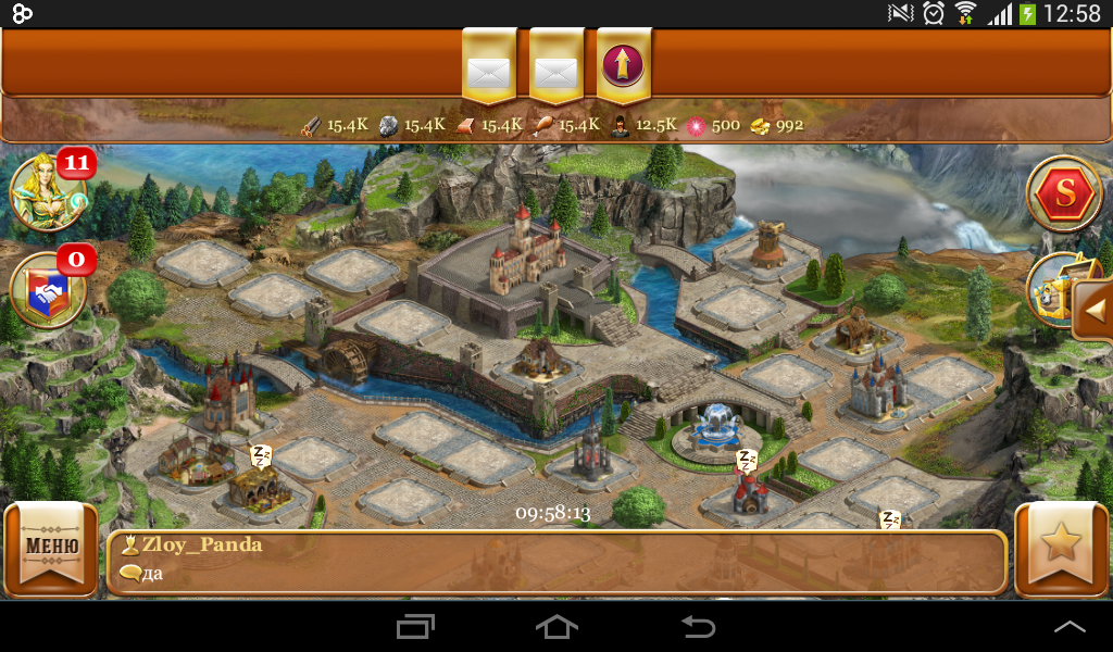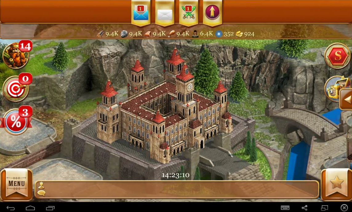 Немного об интерфейсе, вверху находится панель с уведомлениями, где можно узнать состояние ваших военных походов, информацию от альянса и сообщения от советника, который уведомляет игрока о всех изменениях в королевстве, включая доходы и расходы в казне. Внизу есть чат, где общаются реальные люди. Там можно попросить помощи или просто пообщаться. По бокам кнопки перехода между локациями, меню квестов и прочее. Квесты — простые задания, которые постоянно дает игроку внутренний помощник. В основном это задания по улучшению существующих построек, возведению новых, найму армии и прочему. Они помогают вам продвигаться вперед по игре. С квестами игрок вряд ли пропустит какой-то геймплейный момент. Игра насчитывает более 100 таких квестов и 50 дополнительных заданий.