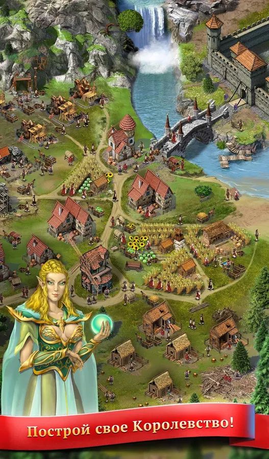 После определения расы, ордена и альянса игроку наконец-то дадут поуправлять своим королевством. И вот здесь любителям градостроительных симуляторов действительно есть где развернуться. Конечно, постройки могут быть возведены только в специально отведенных местах, но с ними можно взаимодействовать и улучшать. Есть две зоны, где можно возводить постройки,— замок с самыми главными зданиями и сельская местность, которая отведена для добычи ресурсов. Ресурсов в игре не так много: дерево, камень, железо, еда, человеческий ресурс, энергия и золото. Первые пять добываются в сельской местности, а вот энергия производится в специальном Генераторе, который находится в замке. Также энергию можно получить в походах на так называемые «Всплески» энергии. Для добычи ресурса из них необходим специальный юнит. Золото — ресурс, который можно понемногу добывать во время игры, либо купить через внутренние покупки.