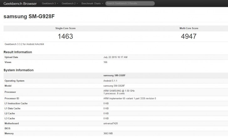 Анонс новеньких фаблетов Samsung Galaxy S6 Edge+ и Galaxy Note 5 состоится уже совсем скоро, как стало известно вчера, — 13 августа. Устройства будут представлены на конференции Galaxy Unpacked 2015 в Нью-Йорке. В преддверии данного события мы узнали много интересной информации о фаблете Galaxy Note 5, а сегодня настал черёд и Galaxy S6 Edge+. Данное устройство, я думаю, ожидаемое многими поклонниками высококлассных смартфонов Samsung, сегодня показалось в бенчмарке Geekbench. Благодаря данной утечке информации мы узнали, что устройство будет работать на базе чипсета с восемью процессорными ядрами с тактовой частотой 1,5 ГГц.