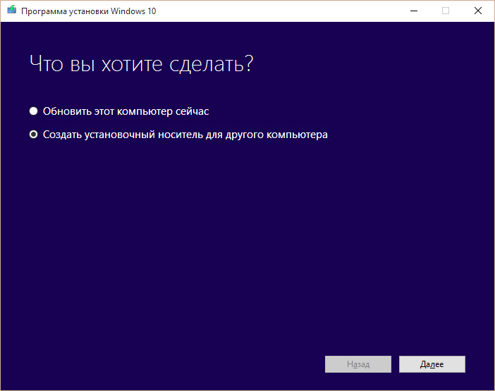 - Выберите пункт «Создать установочный носитель для другого компьютера».