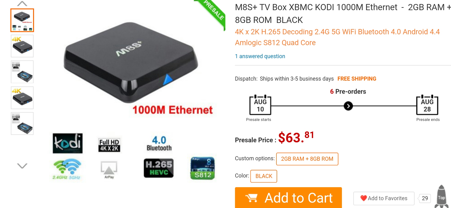 Ответ на этот вопрос также прост: удобнее всего это сделать с помощью интернет-магазина GearBest! M8S+ TV Box XBMC KODI можно предзаказать прямо сейчас всего за $63.81 (скидка на 22%). Однако торопитесь: возможность предзаказа исчезнет 28 августа. Отметим, что в магазине действует бесплатная доставка.