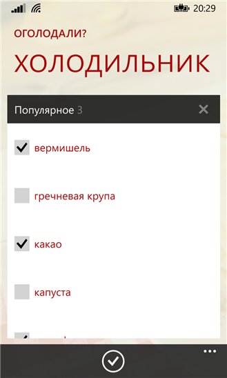 Оголодали Приложения / Windows Phone 8 / Хобби Не знаете, что приготовить? Приложение «Оголодали» поможет вам. Просто укажите, что у вас есть в холодильнике и приложение подберет для вас рецепты. А заодно и подскажет, что еще можно приготовить, если сходить в магазин.Обновлено: 21 августа 2015, 15:32. miracle33213 Пользователь Комментариев пока нет Оставьте комментарий...