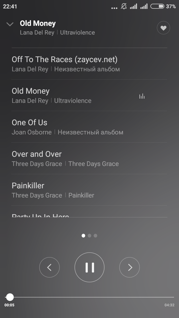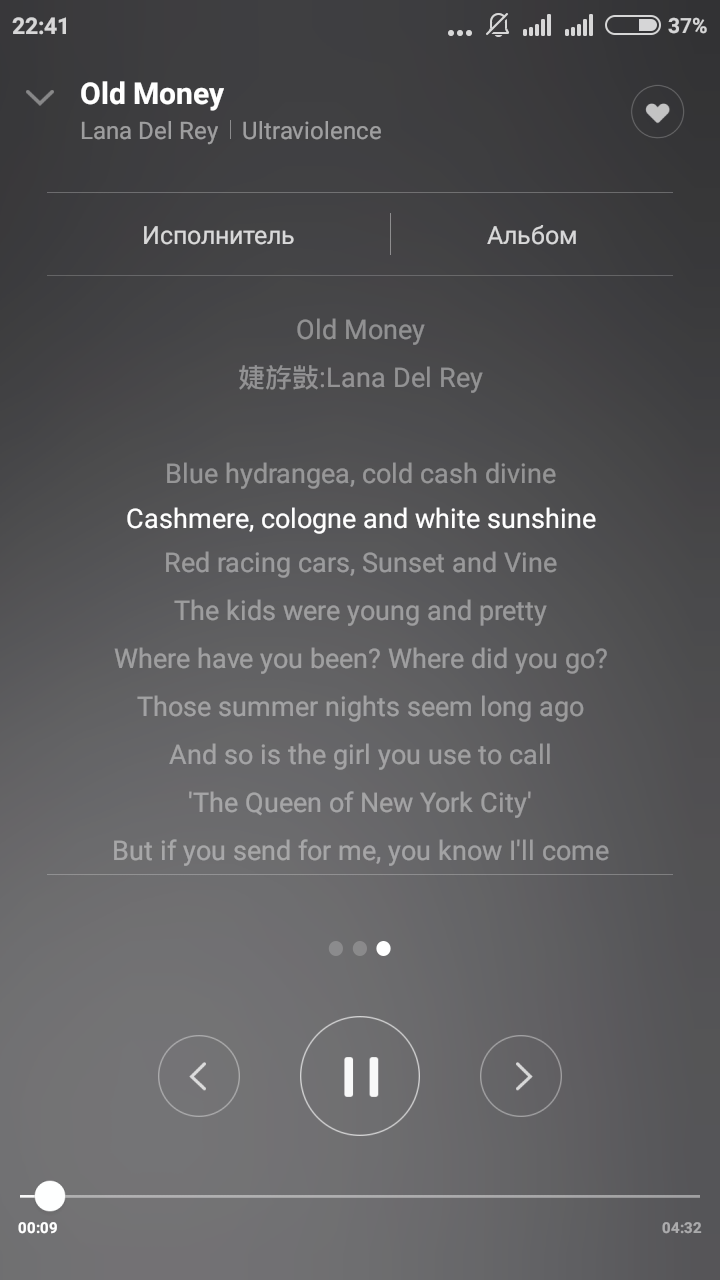Интересной особенностью для меня стала автозагрузка текстов и обложек композиций. Открывается текст свайпом влево. Свайп вправо открывает плейлист.