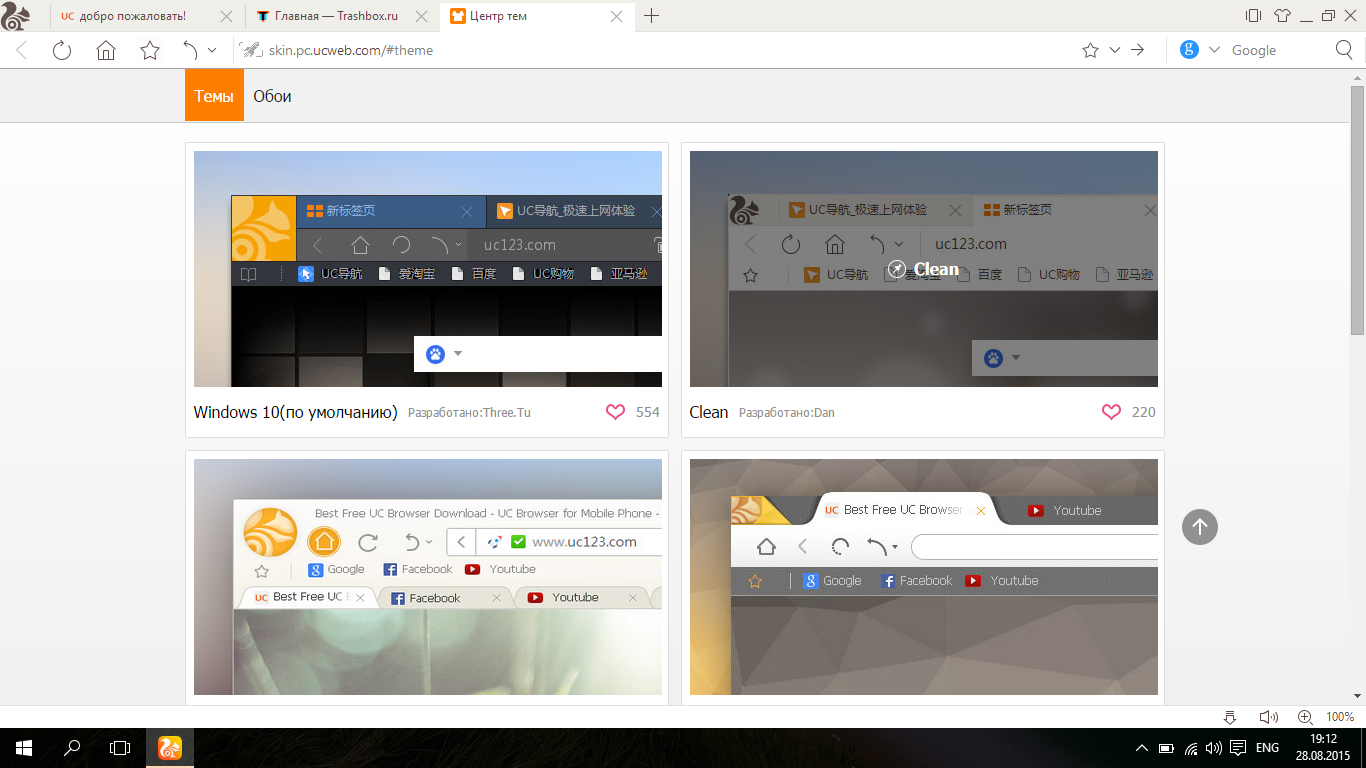 UC Browser в версии для настольной платформы Windows от Microsoft имеет уникальный пользовательский интерфейс, хотя основан на популярном проекте Chromium. По умолчанию установлена тема оформления под названием «Windows 10», однако пользователю доступно на выбор еще целых 12 дизайнерских решений. Каждая из них в корне меняет интерфейс UC Browser — от дизайна закладок до меню настроек. К слову, их все можно найти в Центре тем, кнопка для открытия которого находится возле навигационных «Свернуть», «Развернуть» и «Закрыть».