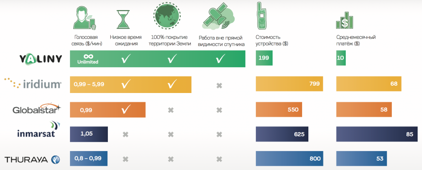 Вчера в Москве российский стартап Yaliny провёл крупную презентацию, на которой рассказал о своих планах в качестве поставщика услуг сотовой связи. Компания заявляет, что является первым мобильным оператором спутниковой связи нового формата, а её технология является уникальной. Среди своих первоочерёдных планов представители стартапа назвали создание инфраструктуры, которая будет основана на низкоорбитальных спутниках. Было сказано, что такие спутники полностью спроектированы инженерами проекта (кроме двигателей), поэтому их стоимость относительно невысока — 6 миллионов долларов. Если у Yaliny получится осуществить задуманное, то она сможет предложить своим абонентам безлимитные звонки и интернет в любой точке земного шара за 10 долларов в месяц.