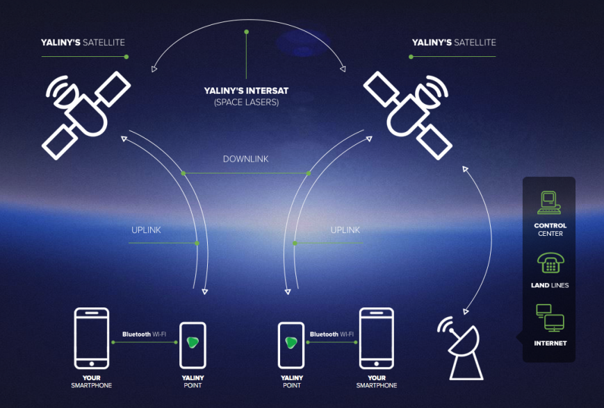Сеть Yaliny, помимо 144 спутников, будет включать в себя наземные базы в количестве 40 штук, которые и будут передавать сигнал непосредственно устройству пользователя. Этим аппаратом будет так называемый Yaliny Point, который можно подключить к своему смартфону или ноутбуку посредством Wi-Fi. Как утверждает компания, Yaliny Point будет работать без прямой видимости со спутником и в любую погоду. Его стоимость составит 200 долларов. На данный момент Yaliny ищет спонсоров, так как для того, чтобы всё заработало, необходимо порядка 1,5 млрд долларов.