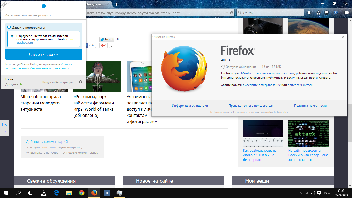 Теперь в Firefox 41 имеется внутренний мессенджер Firefox Hello, который работает с фирменными аккаунтами Firefox. По-сути, это встроенный способ обмена сообщениями между пользователями браузера от Mozilla. Мессенджер разрабатывался компанией Mozilla в сотрудничестве с зарубежным сотовым оператором Telefónica. Особым функционалом Firefox Hello не отличается — он всего-то позволяет обмениваться мгновенными сообщениями, не более. Внутренний чат «браузера-лисицы» работает только на компьютерах, а именно — в версиях Firefox для Windows, Linux и OS X.