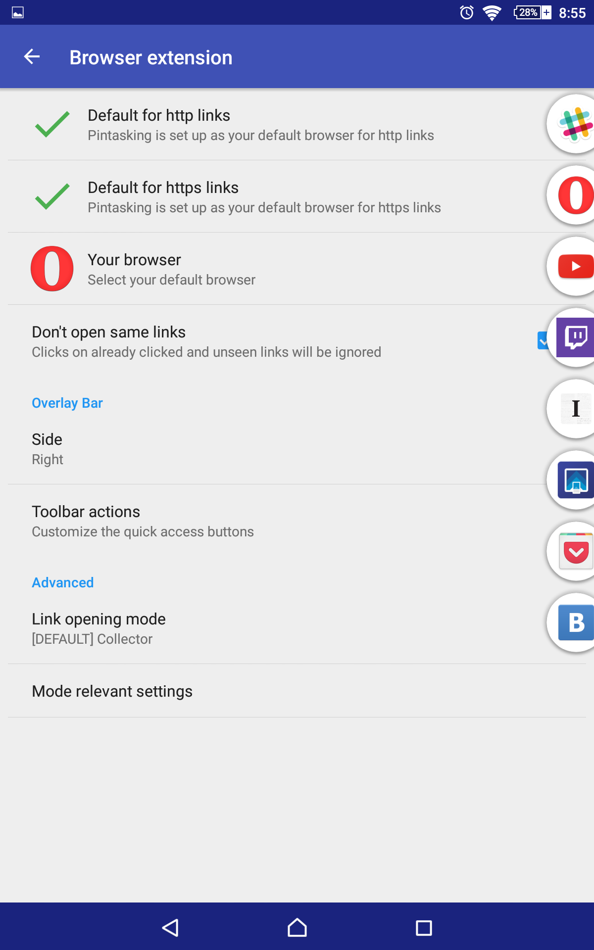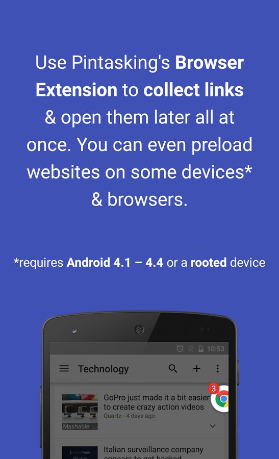 Также в приложении Pintasking присутствует расширение для браузеров. Оно работает при открытии ссылок из других программ. Расширение позволяет «запинить» ссылку, поделиться ей в каком-нибудь приложении или открыть ее в другом браузере. Также этот функционал хорошо интегрирован с Chrome: иконка этого браузера в боковом баре снабжена индикатором открытых вкладок.
