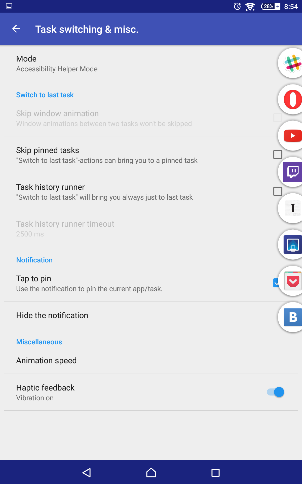 Удобные свайп-жесты — одна из главных функций приложения Pintasking. Настройки программы предлагают активировать два жеста: свайп снизу вверх с кнопки «Домой» (замена вызова Google Now) и свайп с левой части панели бара уведомлений вниз. Лично я вообще не пользуюсь персональным помощником от Google, поэтому замена жеста с кнопки «Домой» далась мне легко. Жест переключает между текущей и предыдущей задачами, что довольно удобно. Мне как, пользователю смартфона BlackBerry, где жест снизу вверх является системным, понравились возможности Pintasking в этом плане.