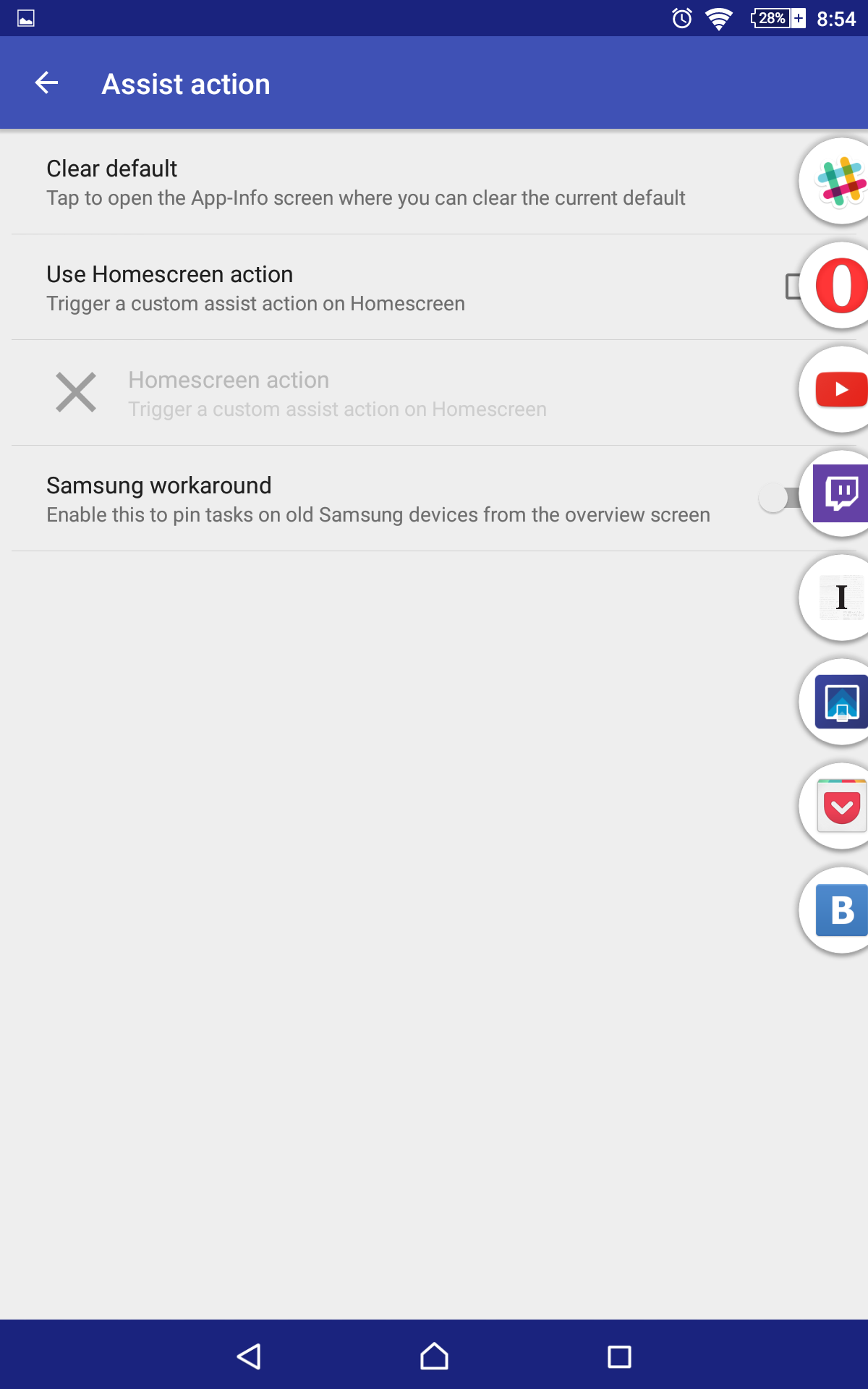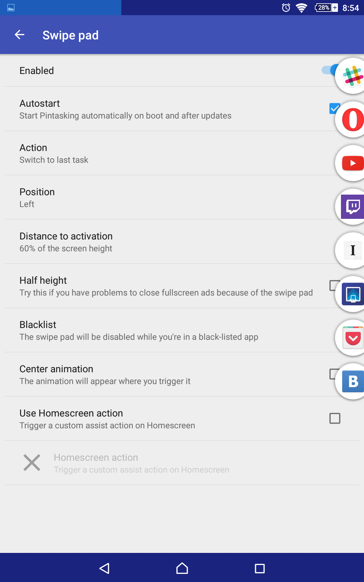 Если же вам дорог запуск Google Now одним жестом, то разработчики Pintasking предусмотрели и этот момент. В настройках приложения присутствует функция Assist Action, которая позволяет назначить запуск браузера или ассистента Google Now на свайп-жест сверху вниз. Функция доступна только в платной версии приложения.