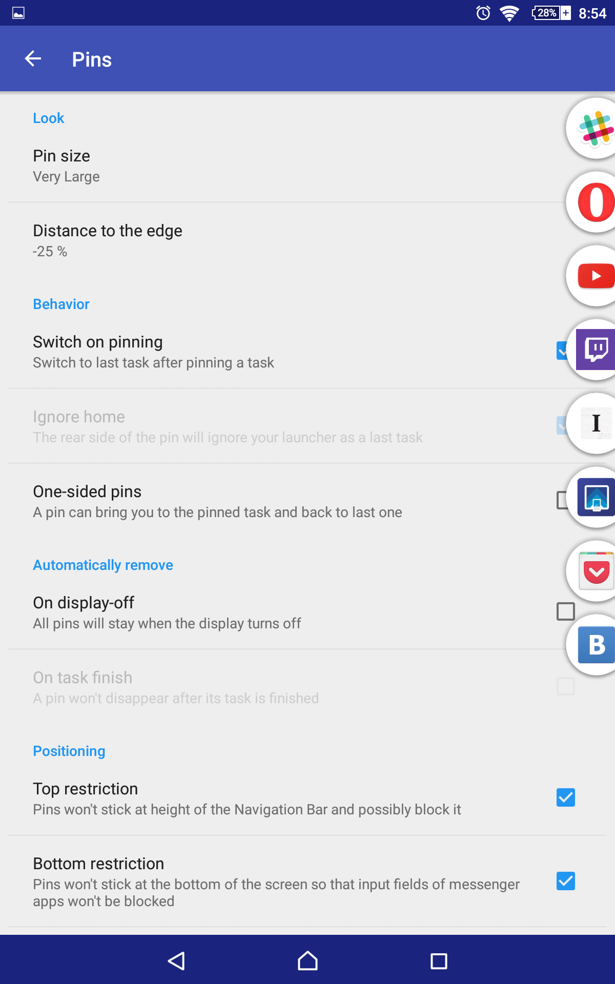 В Pintasking полно интересных настроек и скрытых возможностей. Например, на устройствах с root-доступом есть возможность убрать задержку при переключении задач. Также можно настроить размер и положение иконок в боковом баре, включить или выключить жесты, увеличить или уменьшить скорость анимаций. И большинство этих возможностей доступны только в платной версии приложения. Создатели Pintasking максимально ограничили функционал бесплатного приложения. В нем пользователи могут закрепить только две иконки без настроек. Весь потенциал приложения раскрывается только в платной версии.