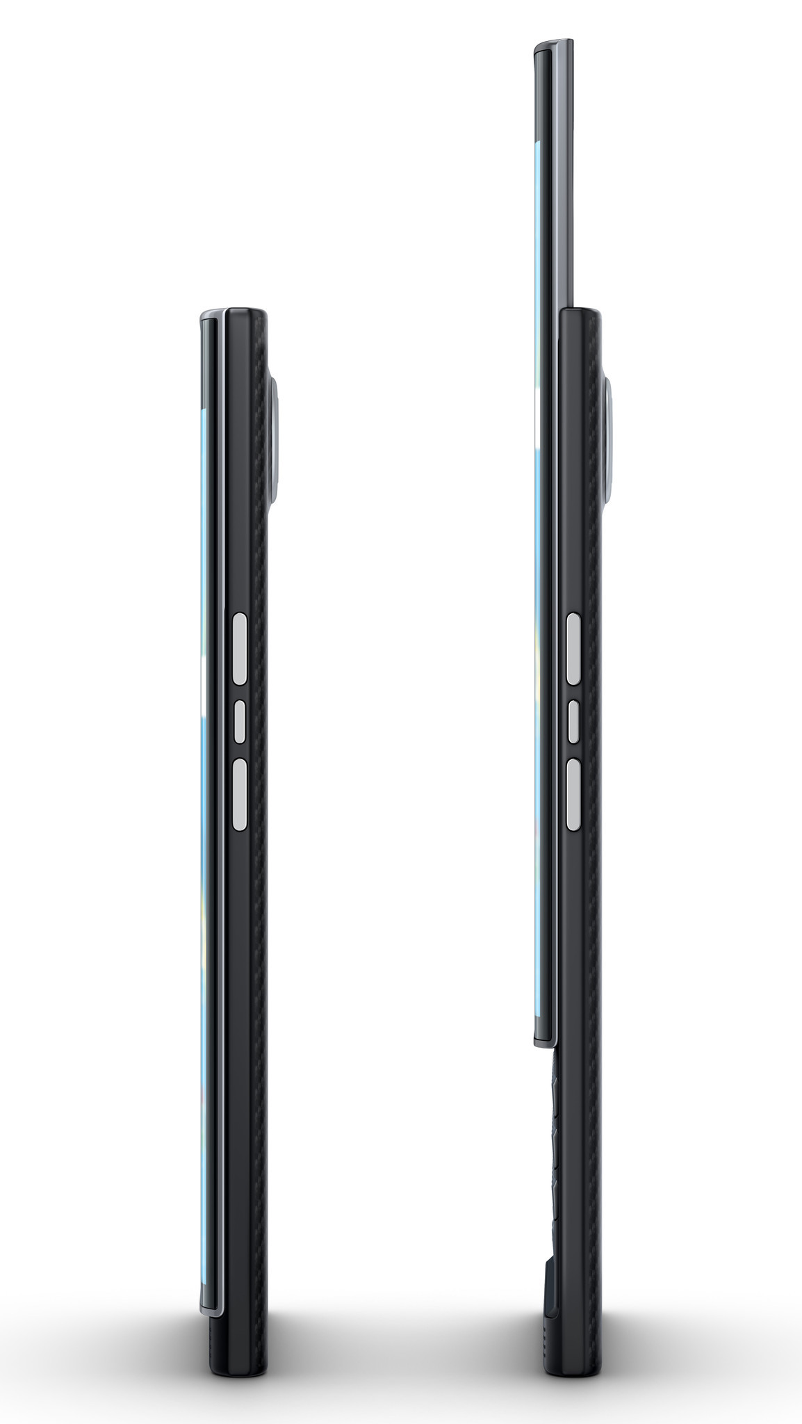 Три изображения демонстрируют новый BlackBerry Priv с разных сторон. На двух фото, где показаны боковые стороны смартфона, можно увидеть, насколько увеличится BlackBerry Priv при выдвижении дисплея, а также хорошо заметен выпирающий сенсор камеры. Надо сказать, что в раскрытом состоянии смартфон выглядит довольно длинным. Еще один рендер хорошо показывает клавиатуру и загнутый дисплей аппарата. Никаких характеристик снова не было раскрыто.