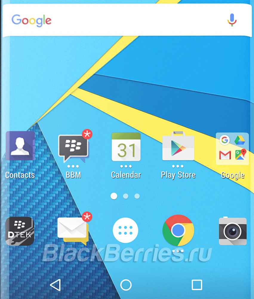 Также вместе с официальными изображениями в сеть попал скриншот главного экрана оболочки, которую получит BlackBerry Priv под управлением Android. Как можно заметить, это будет слегка измененный стоковый Android с предустановленными приложениями BlackBerry, а также фирменным индикатором уведомлений в виде звездочки на красном фоне из BlackBerry OS. Все приложения на рабочем столе уже известны (BBM, BlackBerry Hub, Chrome, Камера, папка с сервисами Google, Play Store, Контакты и Календарь), кроме загадочной иконки под названием DTEK. Возможно, это приложение как-то связано с безопасностью.