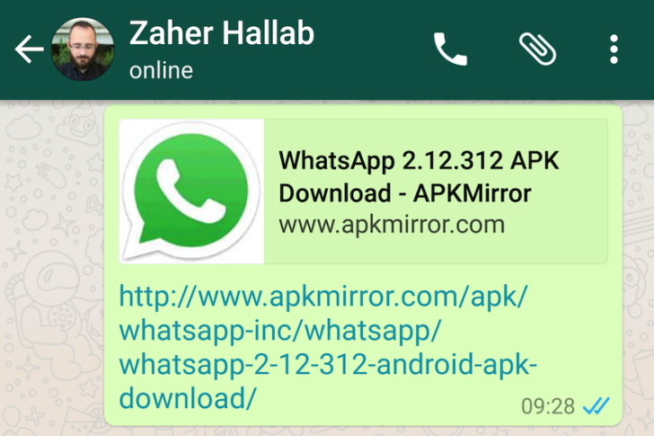 Сообщается, что в WhatsApp* 2.12.312 для Android теперь внутри чатов отображается превью каждой ссылки, а именно — подгружается логотип сайта или главное изображение страницы, а также появляется полный заголовок. Предпросмотр сайта загружается еще на той стадии, когда пользователь печатает сообщение и вставляет в него ссылку. К сожалению, собеседники, у которых установлена версия WhatsApp* ниже 2.12.312, не увидят превью-ссылок в своих чатах.