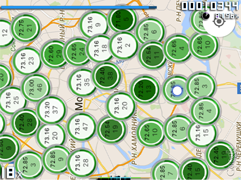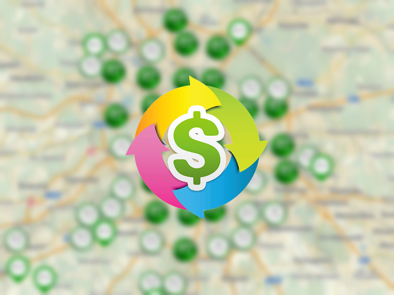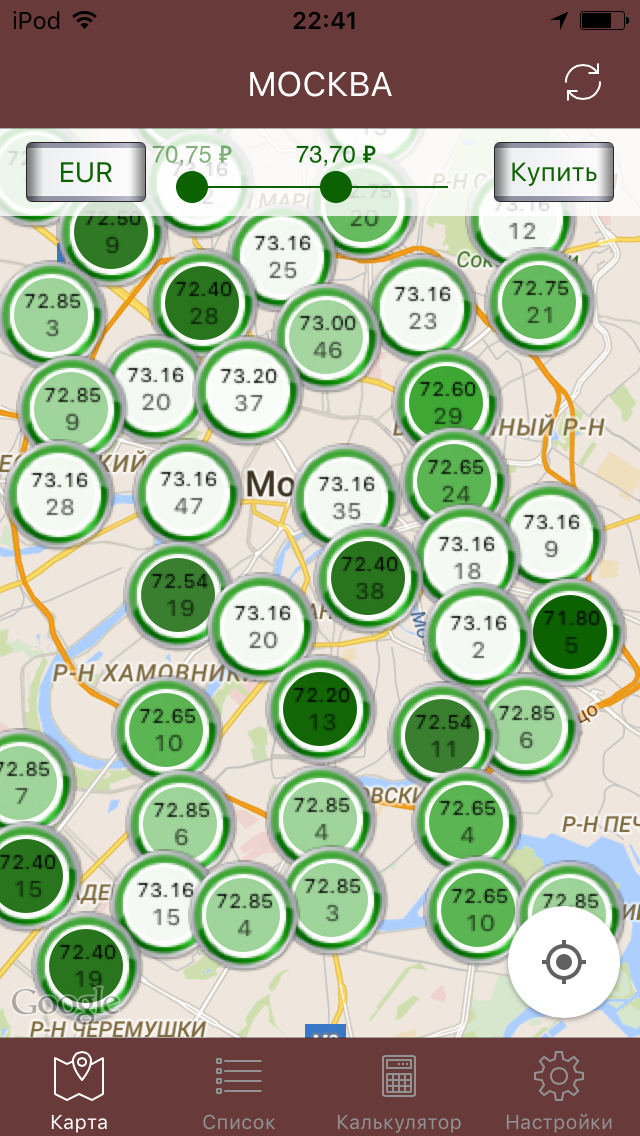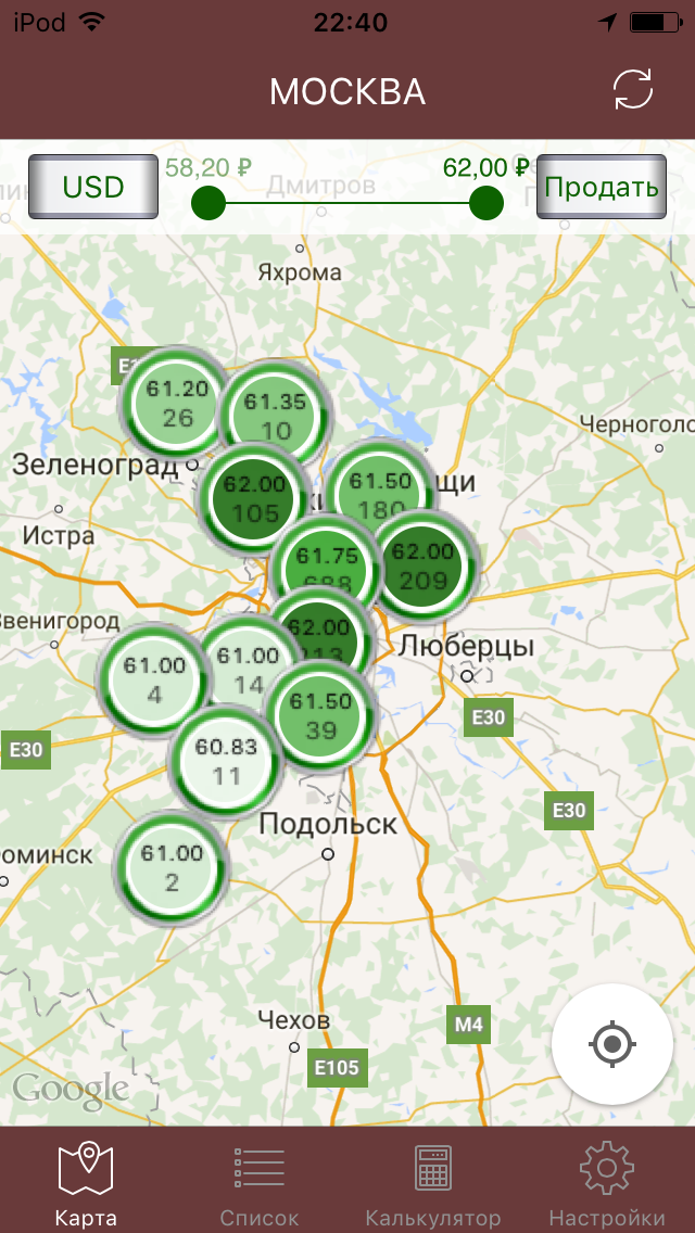 После выбора населенного пункта, в котором вы проживаете, приложение представит вам отмеченные зелеными кругами места, в которых предлагаются самые выгодные курсы обмена валют. Лучший курс валют подсвечивается. Метки являются динамичными, поэтому при увеличении и уменьшении карты их становится больше или меньше соответственно. В последнем случае они просто объединяются в целые кластеры и показывают лучший курс для покупки (самый дешевый) или продажи (самый дорогой).