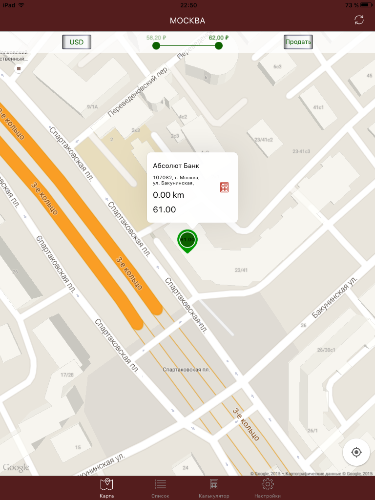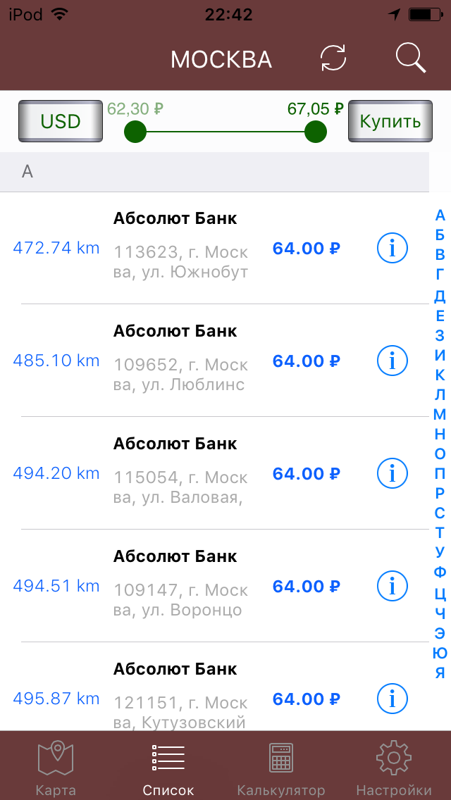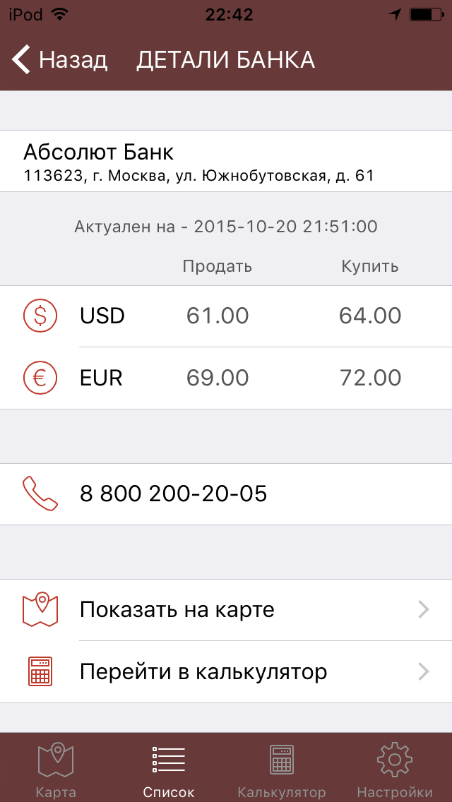 Также приложение располагает еще двумя интересными и полезными функциями — они называются «Список» и «Калькулятор». Первая позволяет просмотреть все ближайшие банки с тем или иным значением доллара или евро. Список, что очень приятно, подробный: пользователю предоставляется такая информация, как название организации, полный адрес, текущая стоимость валюты в рублях, а также расстояние в километрах. В отдельном окне (детали банка) также можно найти актуальность валют и номер телефона банка. Функция особенно порадует тех пользователей, кто не имеет или не хочет использовать GPS-навигатор и самостоятельно искать дорогу до какой-либо местной финансовой организации.