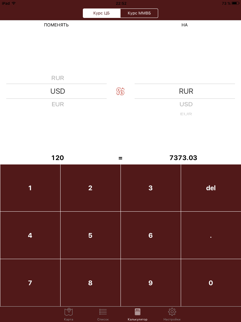 Последней функцией расчетно-валютного сервиса SeekRate для Android и iOS является, как уже было отмечено выше, калькулятор. Исходя из названия, можно понять, что эта функция отвечает за операцию обмена валюты. Вы можете посчитать, сколько рублей в долларе, евро в рубле или долларов в евро по состоянию на сейчас. Обмен можно производить по курсам Центрального банка (ЦБ) и Московской межбанковской валютной биржи (ММВБ).