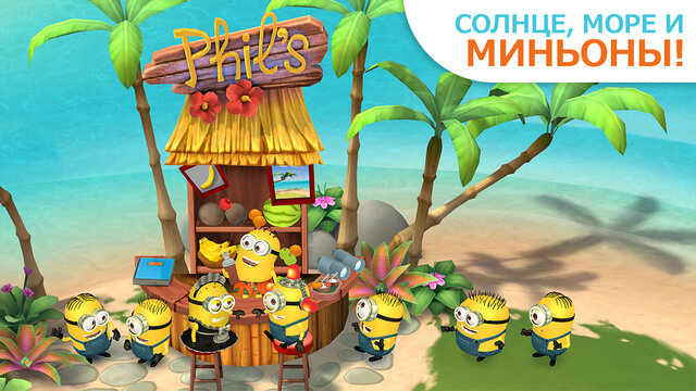 Проведи незабываемые каникулы вместе с миньонами! Фил — очень милый, но неуклюжий миньон, который умудрился затопить корабль своих друзей. Теперь ему предстоит превратить необитаемый остров в райский уголок, чтобы искупить свою вину. Создатели мультфильма «Миньоны» — Illumination Entertainment — и EA приглашают тебя в невероятное приключение с любимыми героями!