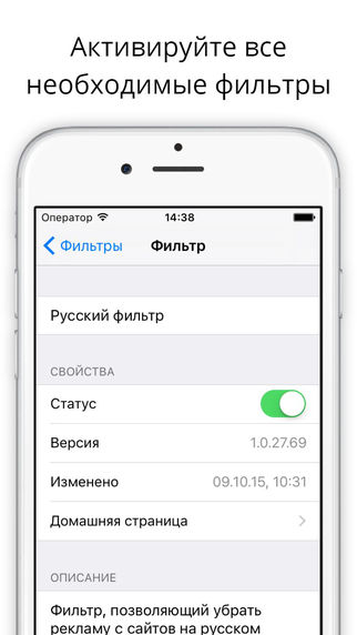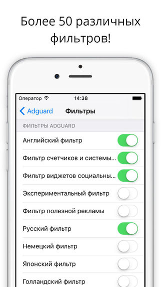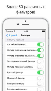 Наконец-то вам доступен лучший блокировщик рекламы для iOS! Adguard поддерживает больше 50 (!) разных фильтров, оптимизированных для Safari, включая фильтр для Рунета. Пользуйтесь чистым, быстрым и безопасным интернетом в Safari с антибаннером от Adguard.