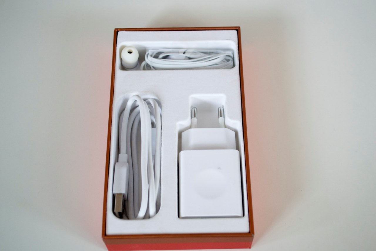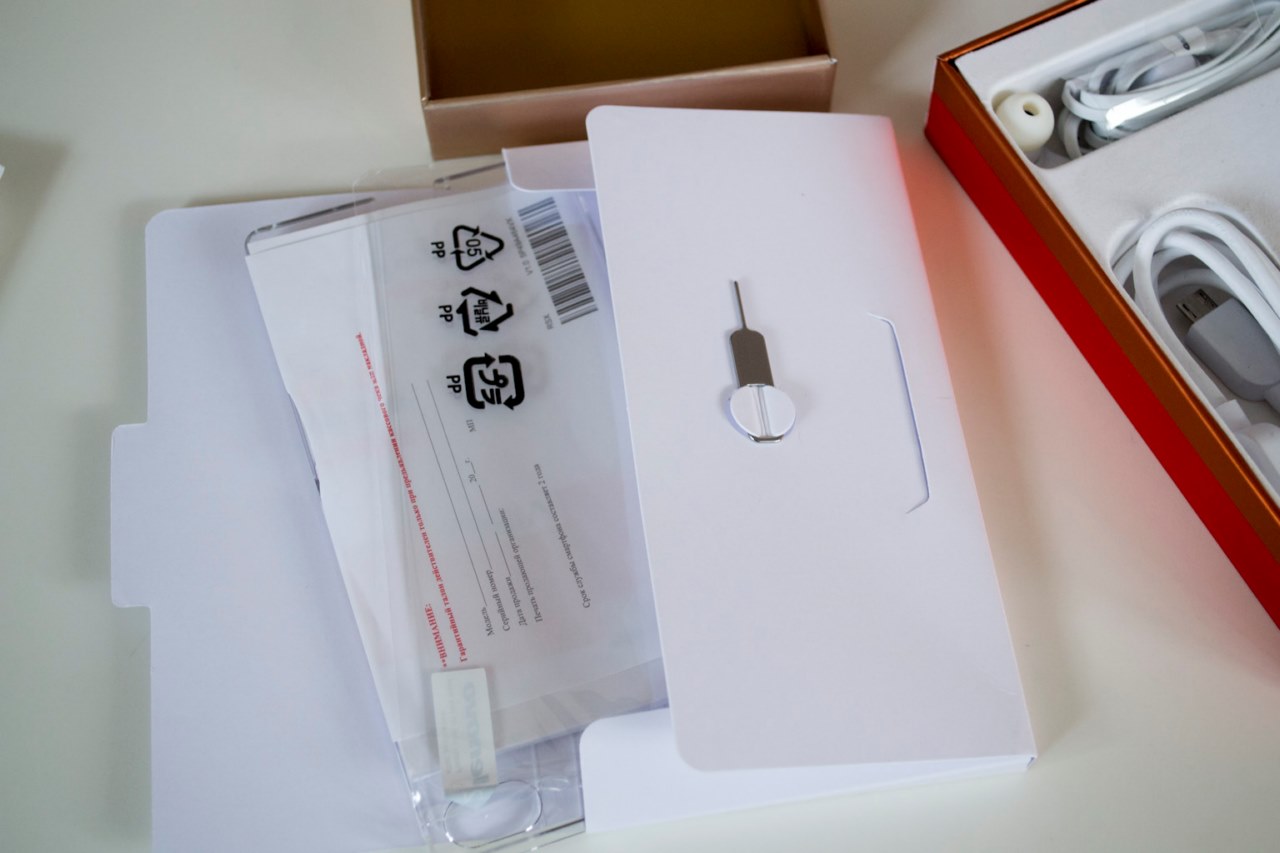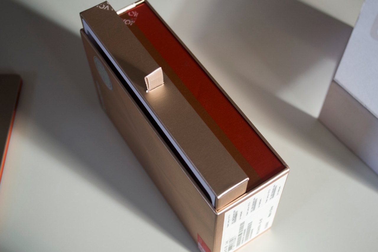Смартфон прибыл в небольшой коробке из плотного картона, выполненной в трех цветах: основная часть золотистая, а выдвигающаяся — из нескольких цветов, в зависимости от цвета корпуса смартфона. Вся эта конструкция выдвигается при помощи небольшой ленты, и дополнительно защищена чехлом из мягкого картона.