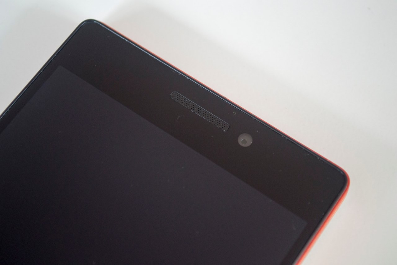 Лицевую сторону практически полностью занимает 5-дюймовый экран, обрамленный по бокам очень тонкими рамками, чуть меньше 3 мм. Сверху над экраном расположен динамик, объектив фронтальной камеры 5 Мп, датчик освещения/приближения и световой индикатор. Снизу под экраном — сенсорные клавиши управления Android.