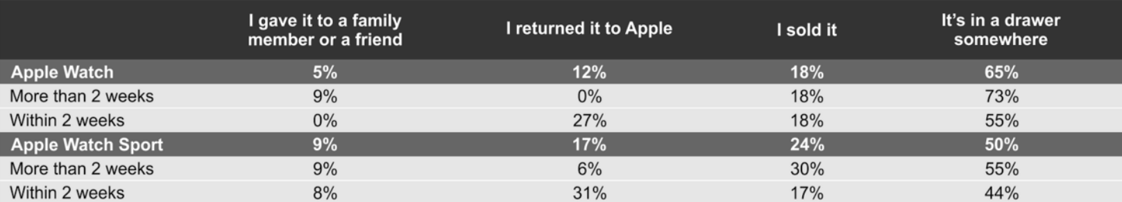 Итак, среди опрошенных пользователей 17 % заявили, что отказались от покупки уже в течение нескольких дней, 28 % — через пару недель, а 55 % «протянули» с Apple Watch более двух недель. От 5 до 9 % владельцев Apple Watch и Apple Watch Sport после недолгого использования отдали их кому-то близкому, от 12 до 17 % — вернули их обратно в магазин, а вот 18-24 % недовольных покупателей продали своё устройство. Однако у большинства пользователей они лежат без дела.