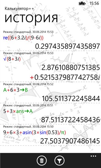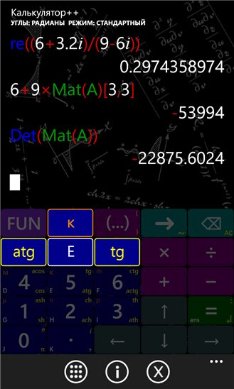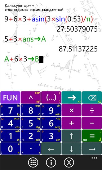 Калькулятор++ умеет делать все! Это отличная замена стандартному калькулятору Windows Phone®. Он позволяет работать с матрицами, комплексными числами, спец. функциями, решать уравнения и строит графики. Вы не найдете более функционального калькулятора! Некоторые из поддерживаемых функций: — комплексные числа — матричные вычисления — работа в шестнадцатиричной, восьмиричной и двоичной системах исчисления — 26 переменных, 26 матричных переменных — математические константы — математические, тригонометрические, гиперболические и специальные функции — история вычислений — темная и светлая темы — подсветка синтаксиса — решение уравнений — CAS Система компьютерной алгебры (символьные вычисления) — возможность определять собственные функции — построение графиков функций.
