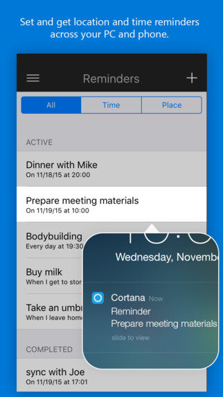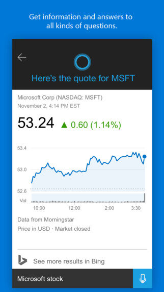 Кортана для iOS не даст вам каких-то особенных функций, но привнесёт элементы от Microsoft. Среди основных функций приложения отмечаются: напоминания, привязанные к локации; отправка сообщения в ответ на звонок при помощи настольной Windows 10; голосовые запросы в интернете и т. д. Но в любом случае, фирменный помощник Siri от Apple будет гораздо удобнее и функциональнее на вашем iOS-гаджете. Кортана для iOS распространяется бесплатно.