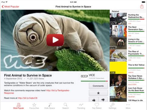 Данное приложение от стороннего разработчика без каких-либо проблем заменит официальный клиент YouTube от Google. Программа YouPlayer несёт в себе специальный модуль, благодаря чему вы сможете смотреть видеоролики хостинга YouTube поверх любого приложения на вашем iPad. Стоит отметить также приятный и удобный для пользователя интерфейс. Более того, вы можете выбрать качество проигрываемого видео нажатием одной кнопки. Присутствуют специальные режимы качества для 3G и Wi-Fi сетей. Кстати, в YouPlayer есть возможность сменить тему оформления, выбирая между светлой и тёмной.