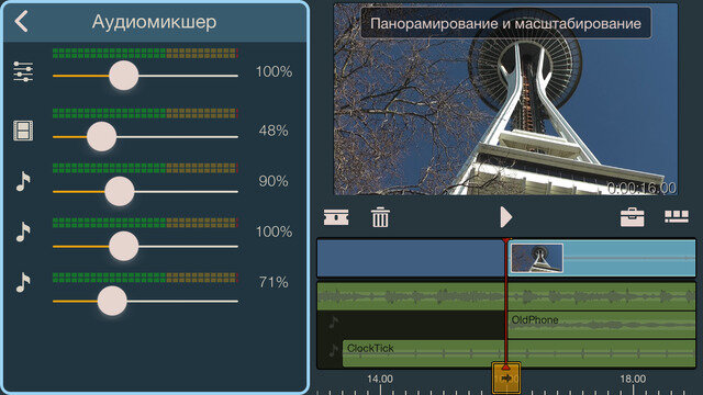 • Просмотр и изменение аудио уровней в реальном времени с профессиональным аудиомикшере