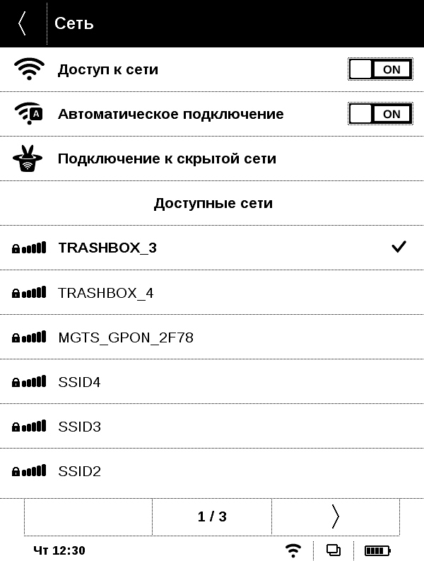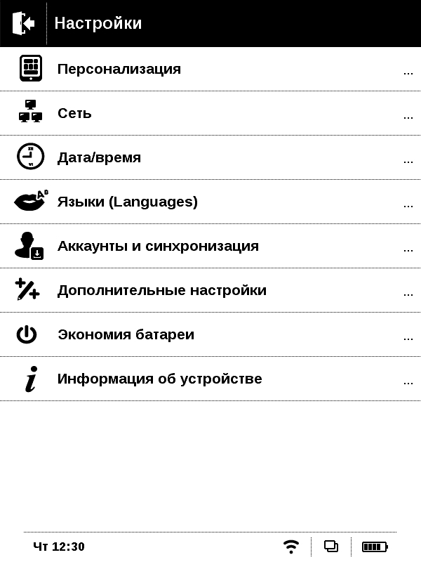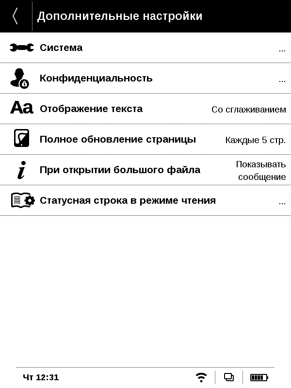 «Электронные» чернила создают эффект прочтения с бумажного листа. Текст контрастный, чёткий, комфортный для чтения. Матовое покрытие дисплея служит отличным антибликовым эффектом, так что можно не беспокоиться о выставлении яркости для чтения в солнечный день.