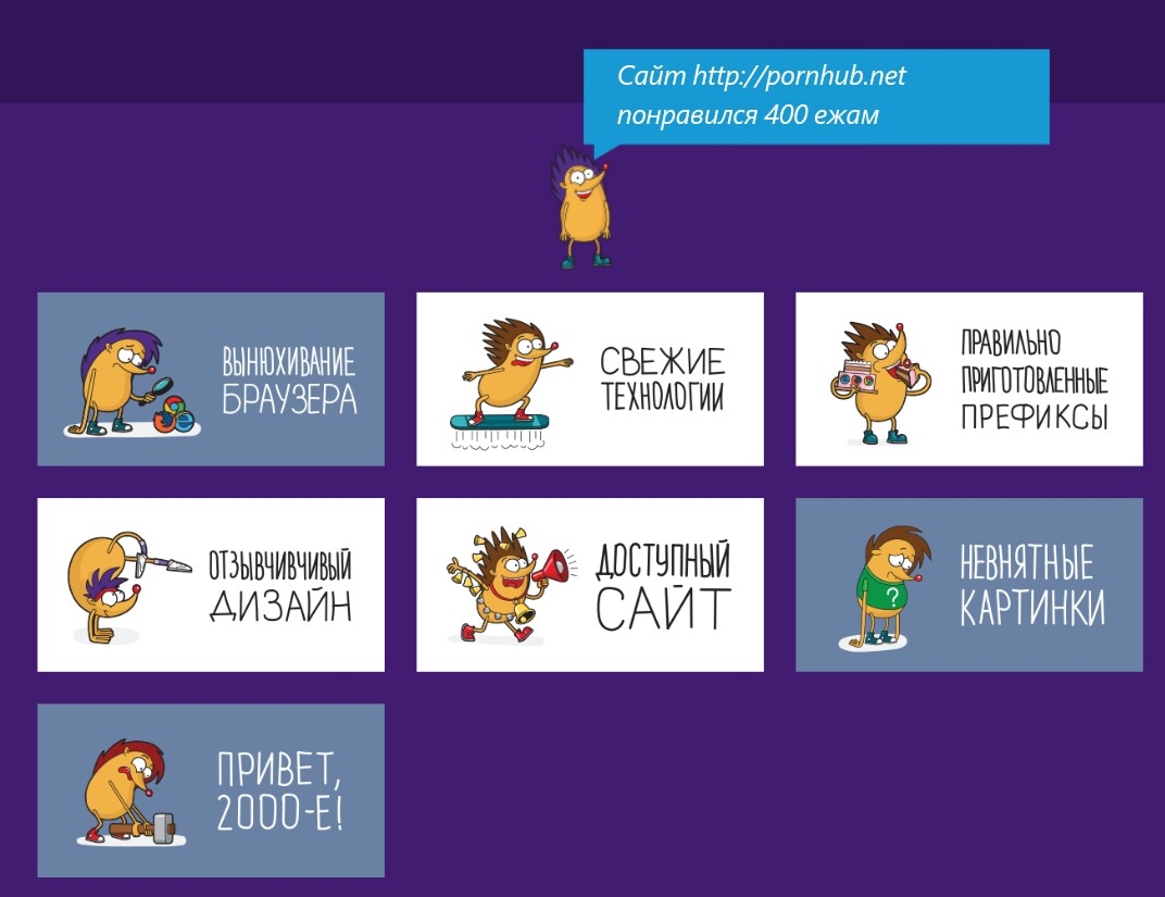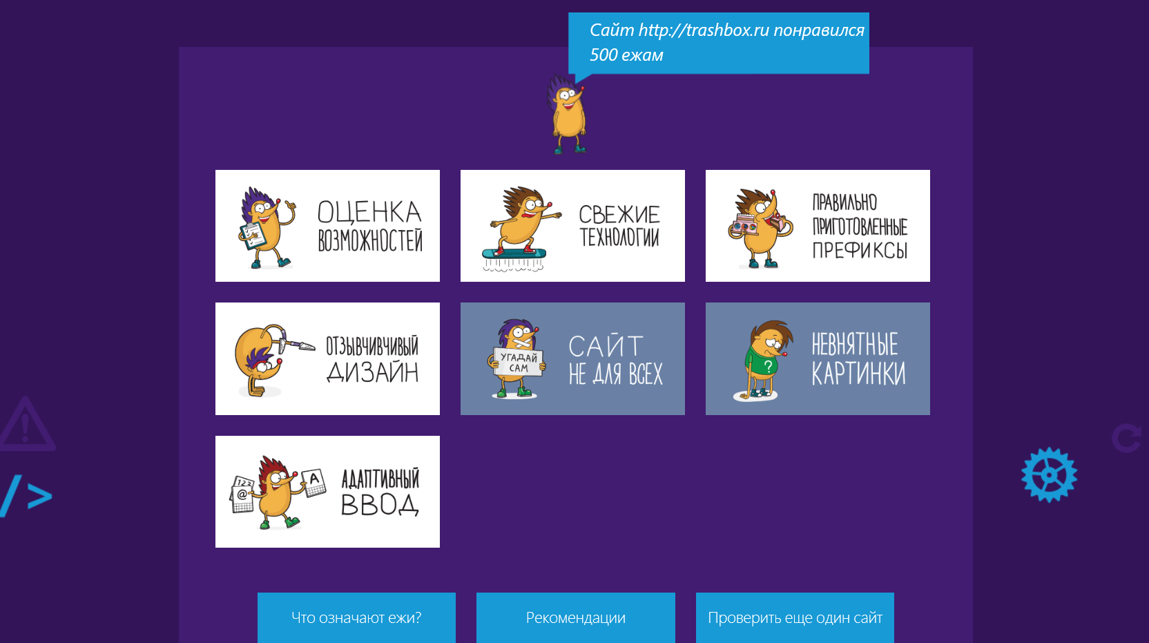 Стоит отметить, что сайт trashbox.ru набрал больше ежей(500), чем сайты microsoft.com, который набрал лишь 100 колючих животных, и apple.com, результат которого — 400. В частности, было отмечено, что Trashbox следует современным практикам “feature detection” и подстраивается под наличие нужной функциональности в браузере, а не под сам браузер, использует самые современные технологии, а дизайн адаптируется под устройства различного форм-фактора.