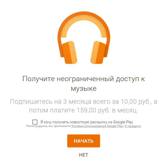 Как «урвать» такое неплохое предложение? Вам нужно перейти на главную страницу сервиса Google Play Music. Найти соответствующий баннер, гласящий о специальном предложении, и нажать на него. Сервис автоматически предложит вам оформить подписку на 3 месяца всего за 10 рублей. Конечно, по истечению трех месяцев будет взиматься стандартная плата за подписку — 159 рублей. Стоит отметить, что владельцы устройств Samsung вообще могут получить три месяца подписки бесплатно.