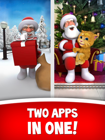 Программка бесплатна, однако можно совершить внутреннюю покупку, приобретя говорящего кота Ginger. После этой покупки вам откроется не только новый персонаж, но ещё и новая сцена в торговом центре. Здесь маленький кот Ginger будет совершать различные шалости и проказы: бегать, переворачивать игрушечные поезда, щекотать Санту. В этом разделе также можно записывать видео, которые потом размещаются на YouTube или отправляются по электронной почте.