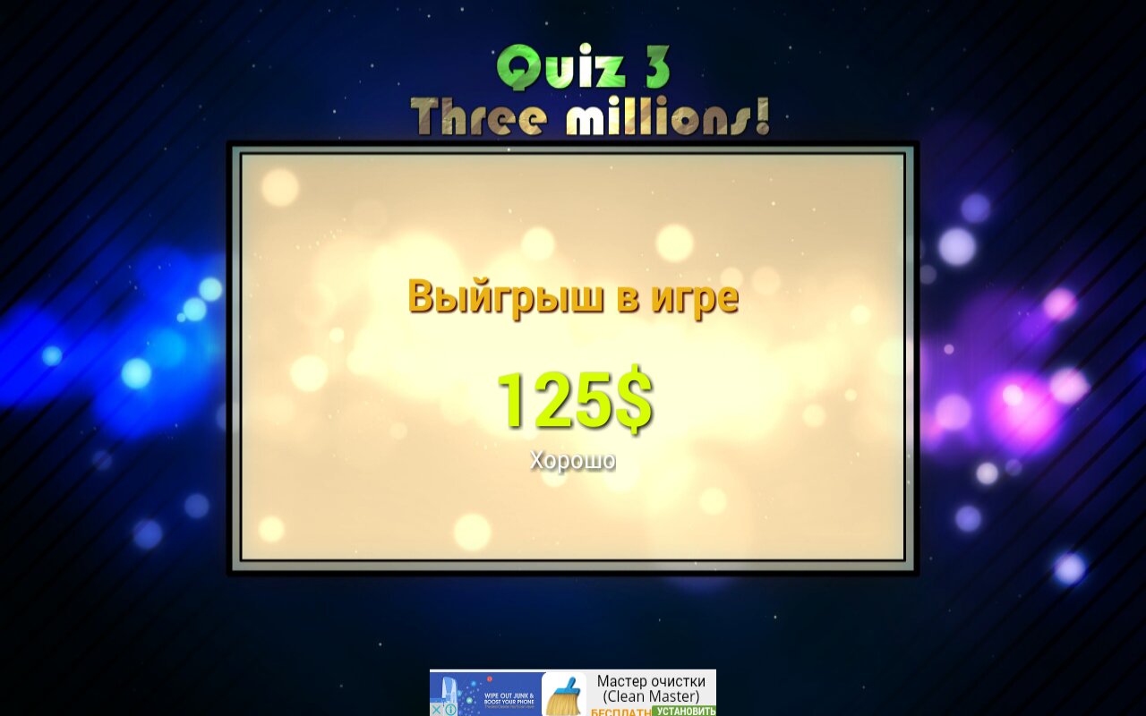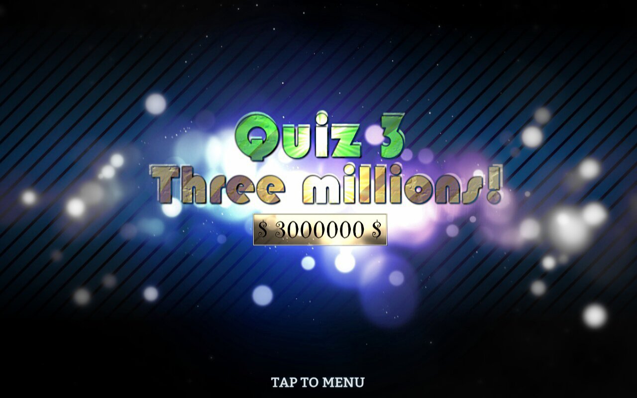 Quiz 3 – интересная игра, в которой как не трудно догадаться, игрок будет отвечать на вопросы. При этом вам будут начисляться игровая валюта, за каждый правильный ответ. Самый последний вопрос сделает вас обладателем трех миллионов долларов, так что обязательно стоит начать играть в игру Quiz 3. Вместе с тем, тут есть системы пропуска трех нежелательных для вас вопросов. Так что если вы дошли до большой суммы и не желаете ее терять, то всегда есть возможность воспользоваться такой помощью. В игре все вопросы разбиты на огромное количество категорий и тем. Другими словами, нужно быть всесторонне развитым человеком, чтобы правильно отвечать на тонкие технические вопросы, замешанные на культуре или спорте. Именно поэтому играть в данную викторину так интересно. Каждый игрок сможет испытать свою эрудицию на прочность. Полезность игры в том, что отвечая на вопросы, вы будет расширять свои познания, что однозначно полезно. Благодаря такому подходу, игра получило широкое распространение среди. Играть в нее можно практически в любом месте, для этого не потребуются особые условия. В результате, Quiz 3 – отличная игра, в которой можно попробовать себя на прочность знаний о многих вещах и предметах, а так же выиграть три миллиона!