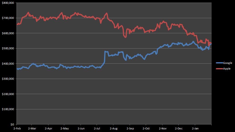 Итогом биржевых торгов 1 февраля 2016 года стало то, что холдинг Alphabet отобрал у Apple звание самой дорогой компании в мире. Капитализация Alphabet составила 570 миллиардов долларов, а Apple – 535 миллиардов.