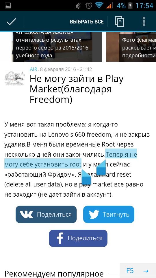 У меня вот такая проблема: я когда-то установить на Lenovo s 660 freedom, и не закрыв удалив.В меня были временные Root через несколько дней они закончились.Тепер я не могу себе установить root и у меня сейчас «работающий Фридом». Я делал hard reset (delete all user data), но в play market все равно не заходит (не дает зайти в аккаунт).