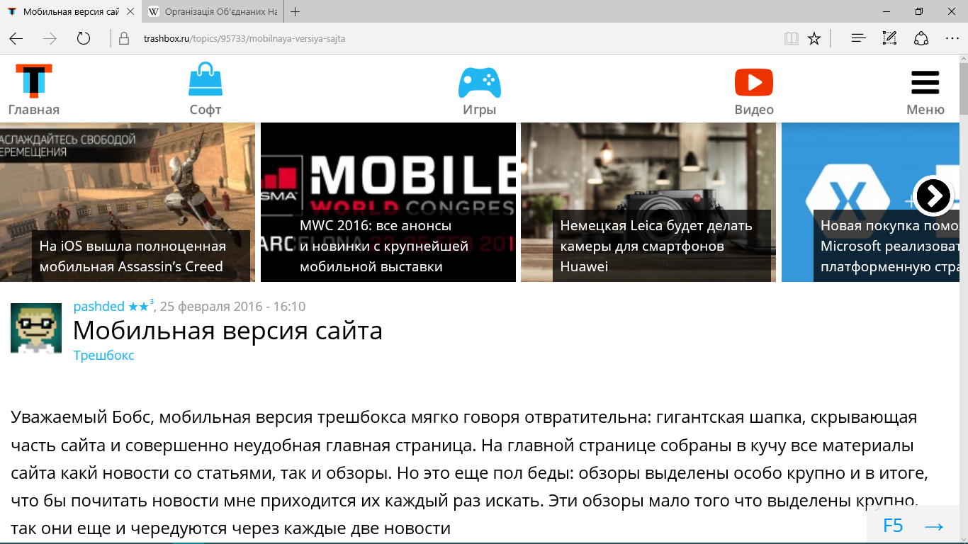 Уважаемый Бобс, мобильная версия трешбокса мягко говоря отвратительна: гигантская шапка, скрывающая часть сайта и совершенно неудобная главная страница. На главной странице собраны в кучу все материалы сайта какй новости со статьями, так и обзоры. Но это еще пол беды: обзоры выделены особо крупно и в итоге, что бы почитать новости мне приходится их каждый раз искать. Эти обзоры мало того что выделены крупно, так они еще и чередуются через каждые две новости